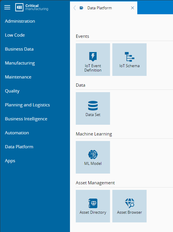 The Data Platform page group enables the user to visualize the current assets associated to the system through the use of the IoT Data Platform application, from IoT Consumers that are used in the system and that have been created from the existing and active IoT Consumer Definitions to the configuration of higher-level objects, constructs and easy-to-use configuration and visualization of data under the abstraction of Assets included in Asset Directories.