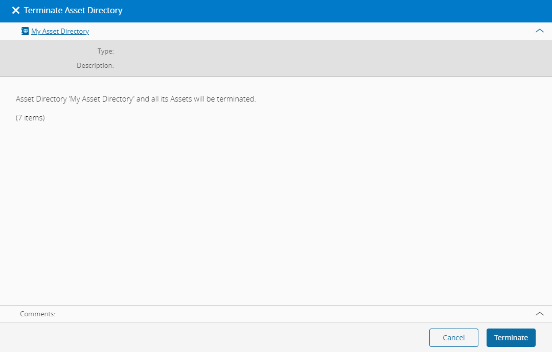 The Terminate Asset Directory wizard can be called from the Asset Directory page within the Data Platform section.