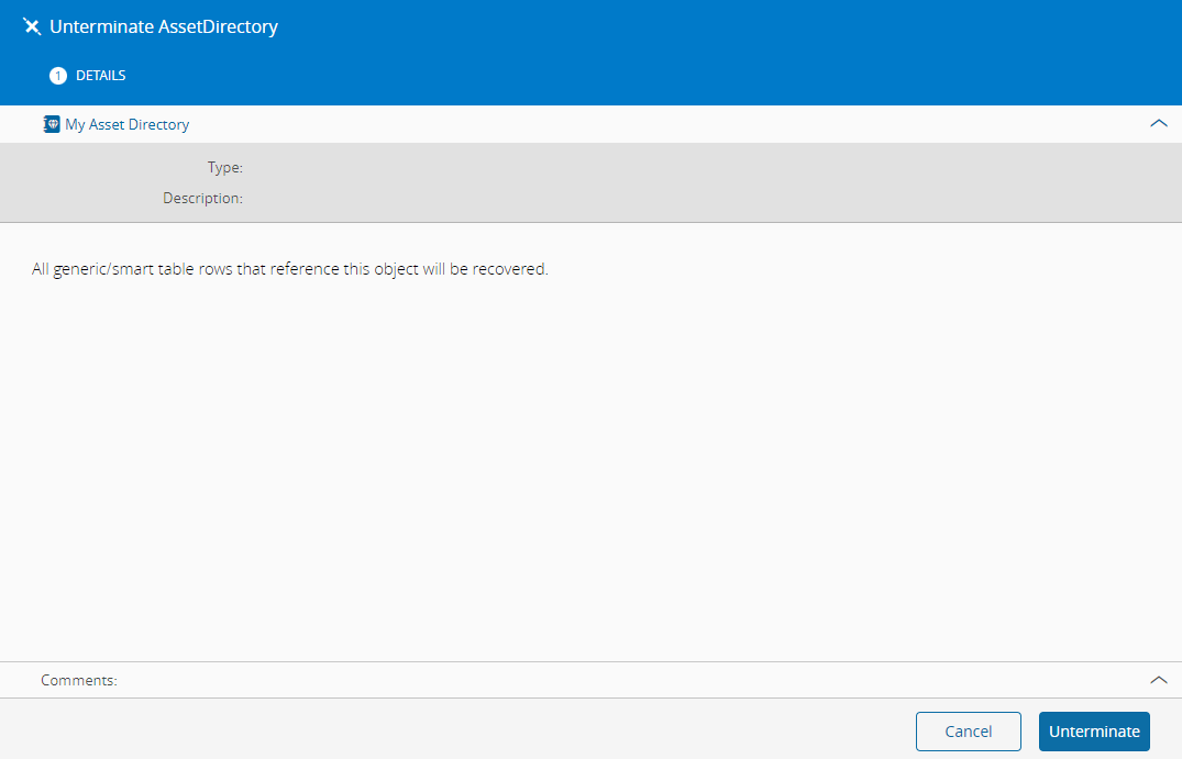 - Press Unterminate to perform the operation. All generic/smart table rows that reference this object will be recovered.
