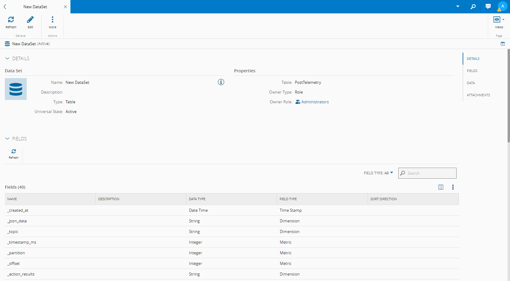 Fields: This section lists all the properties in a paginated table, of the corresponding Data Set. The visualization of the