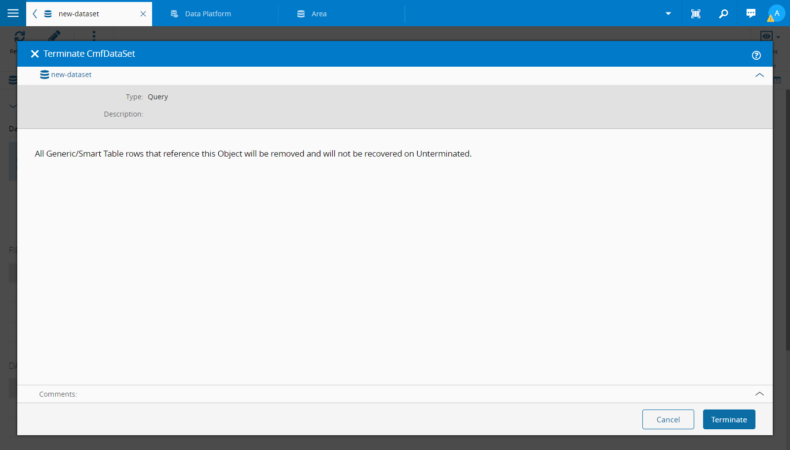 Select Terminate to perform the operation. All generic/smart table rows that reference the current object will be removed and will not be recovered if the object is unterminated at a later point.