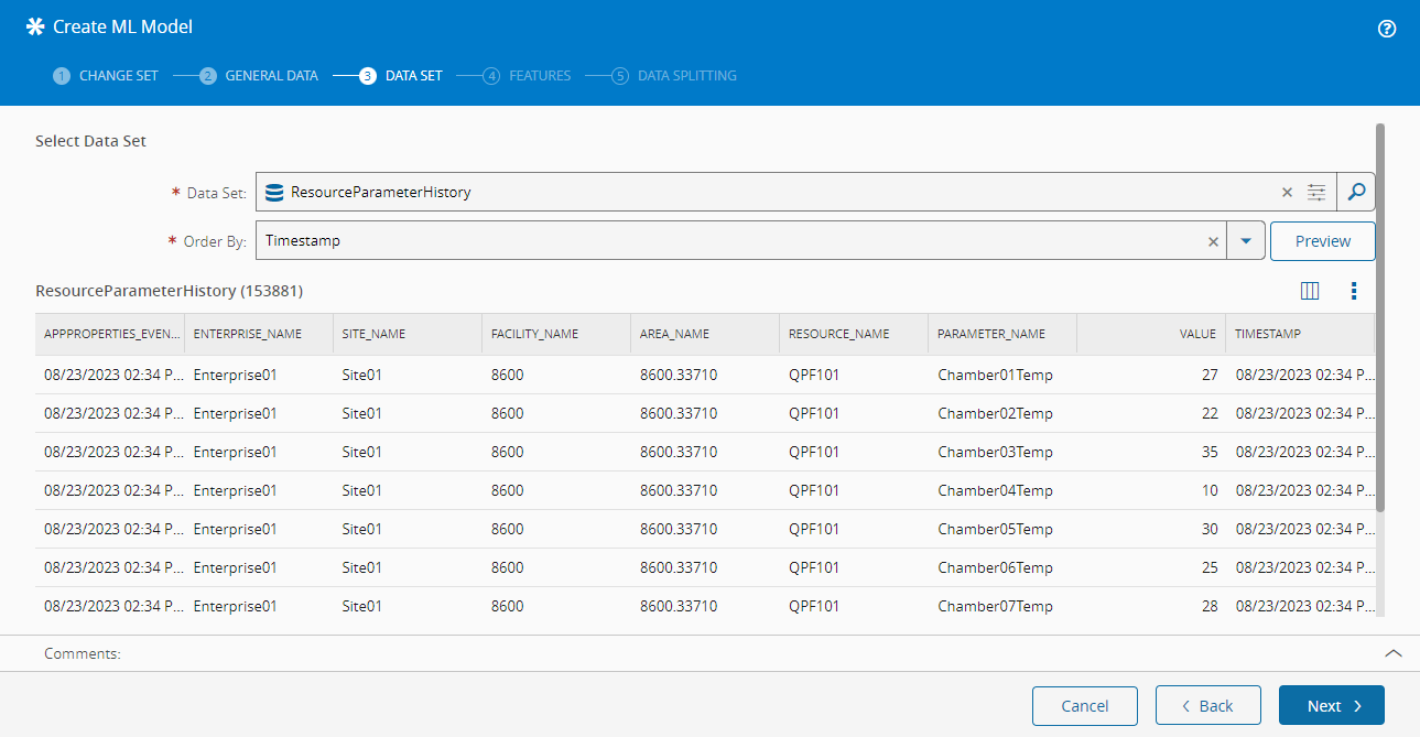 - Choose a Data Set that will be used as the source of data for this ML Model.