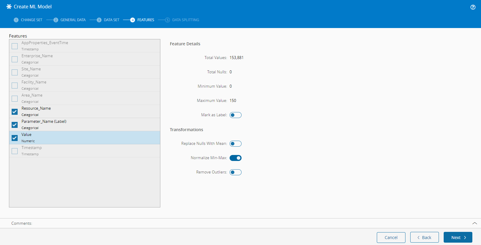 In this tab, you will be able to view a summary of the data as well as edit the properties and transformations applied to the features associated to each of the fields retrieved through the selected Data Set.