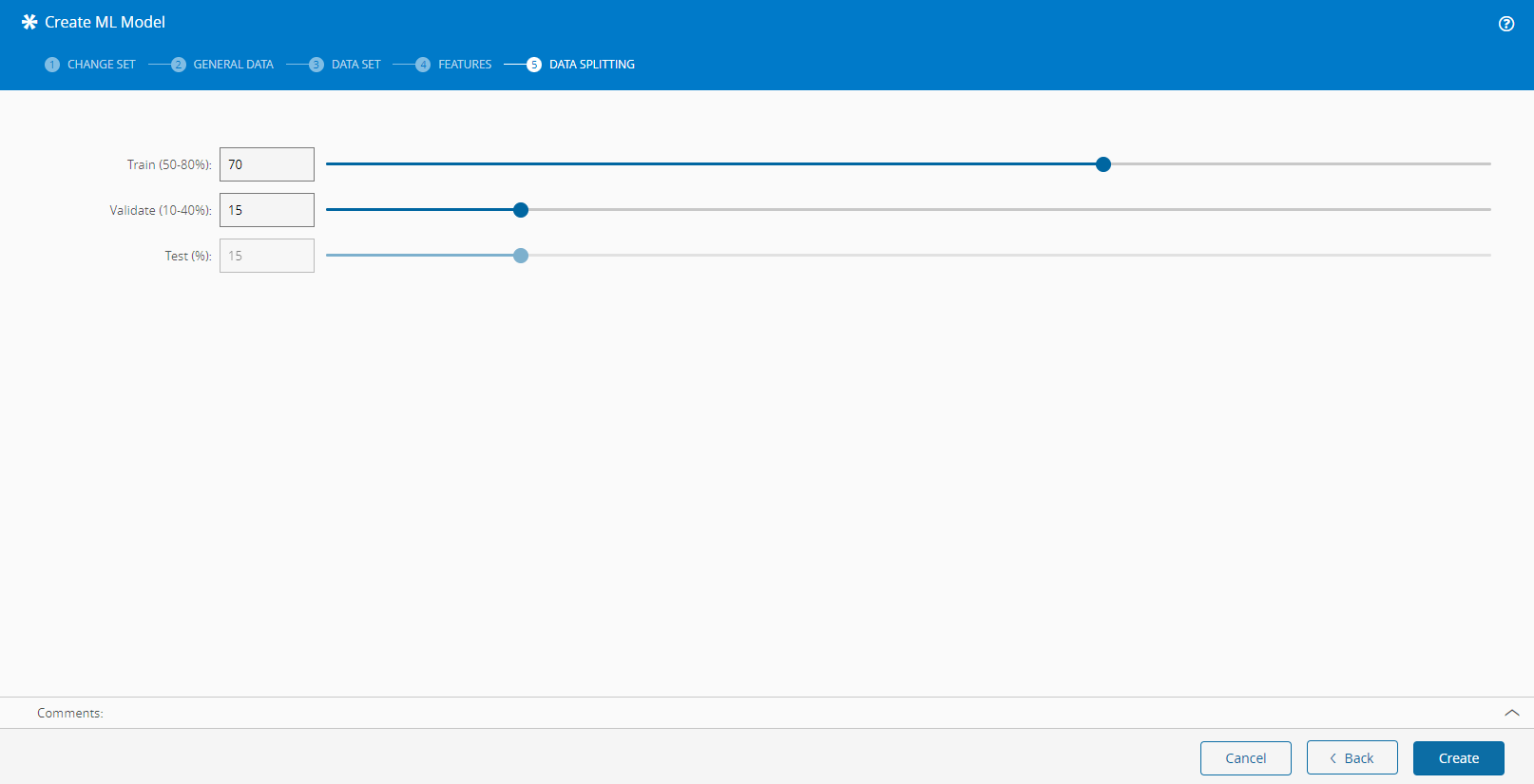 In this tab, choose the different weight that the ML Model will follow. It is possible to combine different criteria, either by adjusting the sliders or by inputting the proportion of records to be included in each set.