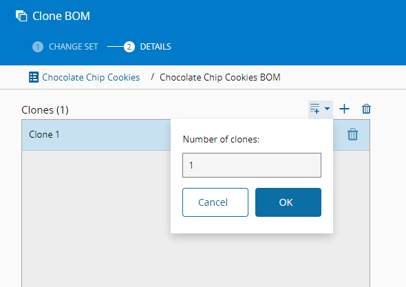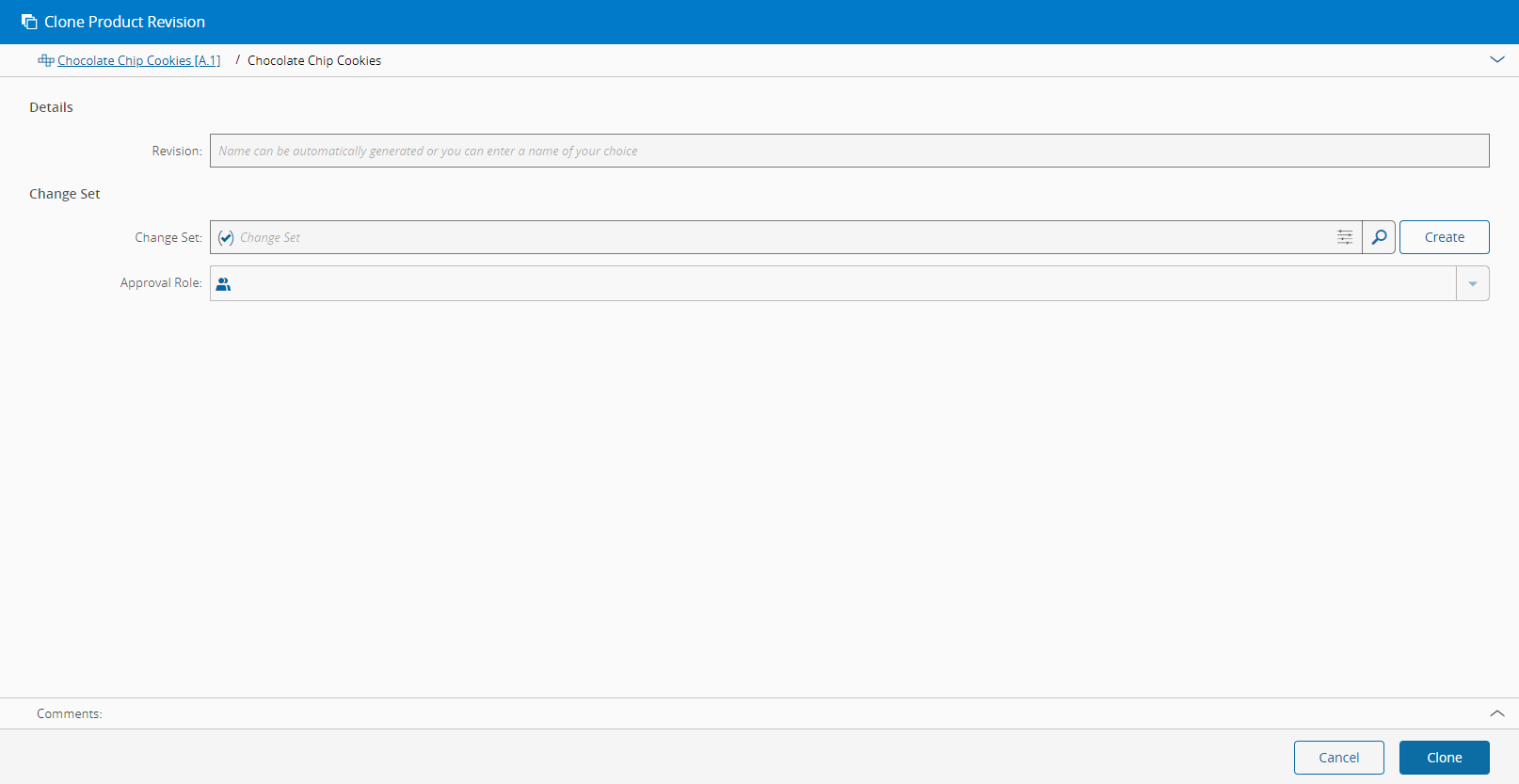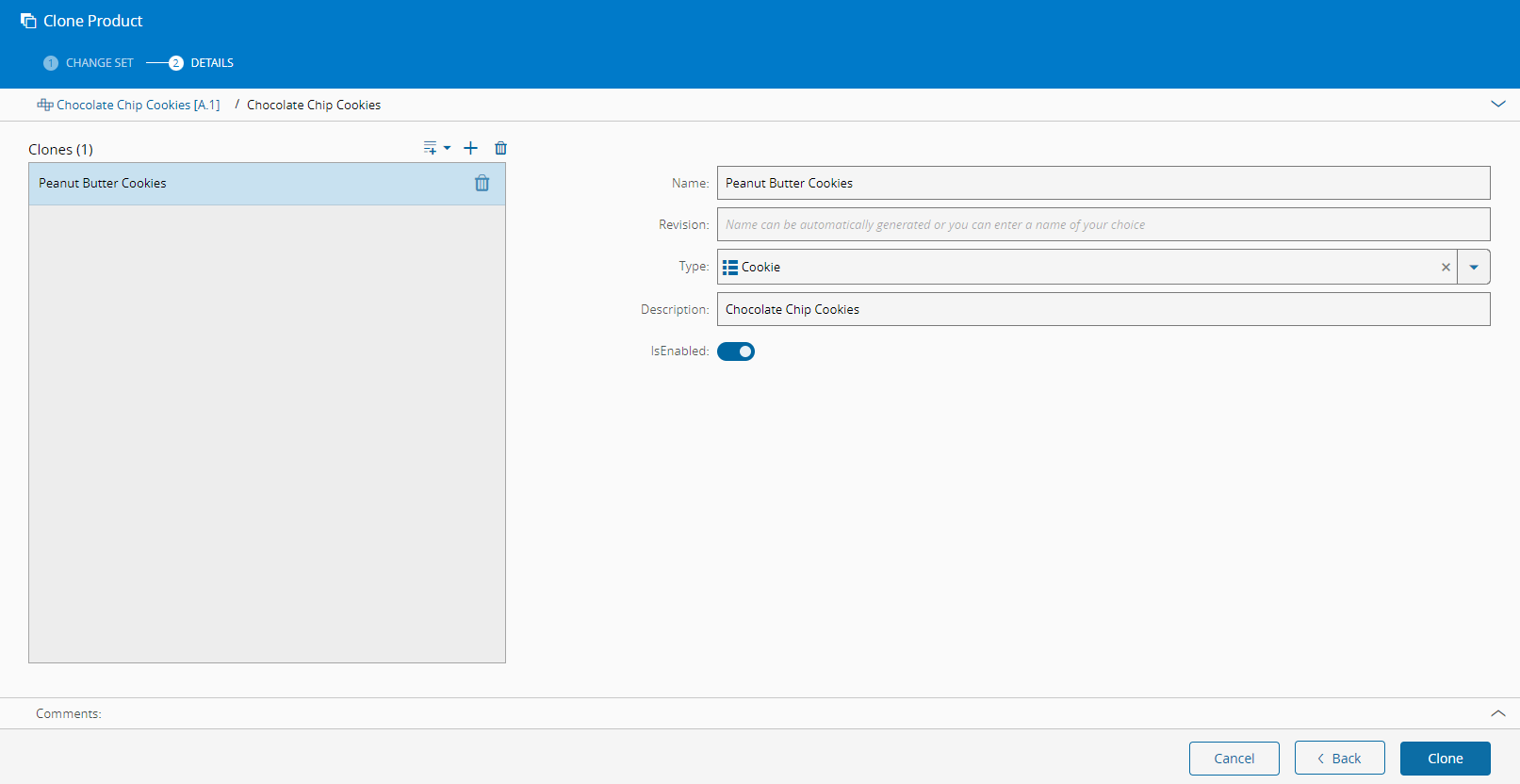 Cloning a single revision will create a new revision based on the features and characteristics of the original revision while remaining associated to the same original entity. A Change Set will be associated to the first version that is created and associated to the new revision.