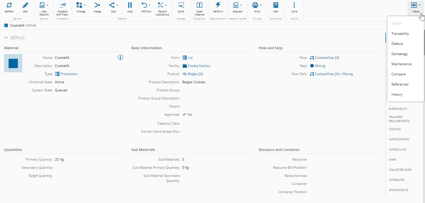 You can see an example of the views available for the Material page: