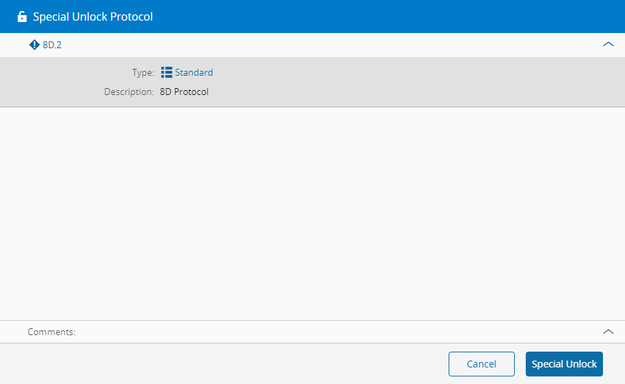 If you want to unlock an object that was locked by another user, you need to perform a special unlock action. To perform this action, open the locked object page and select Special Unlock on the top ribbon to open the corresponding wizard.