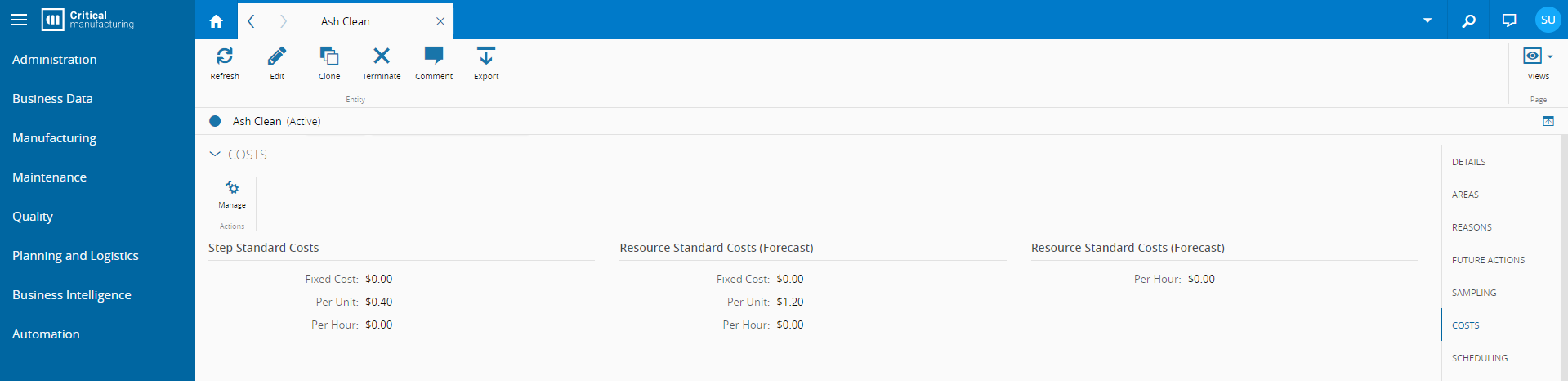 In addition, it enables the user to manage and edit these Costs. For more information on the Manage Costs operation, visit the pages Manage Step Costs and Manage Resource Costs.