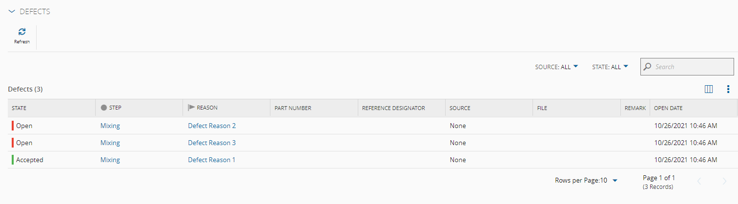 The Defects section is displayed in the Material details view page and enables you to access the defects of that specific Material.