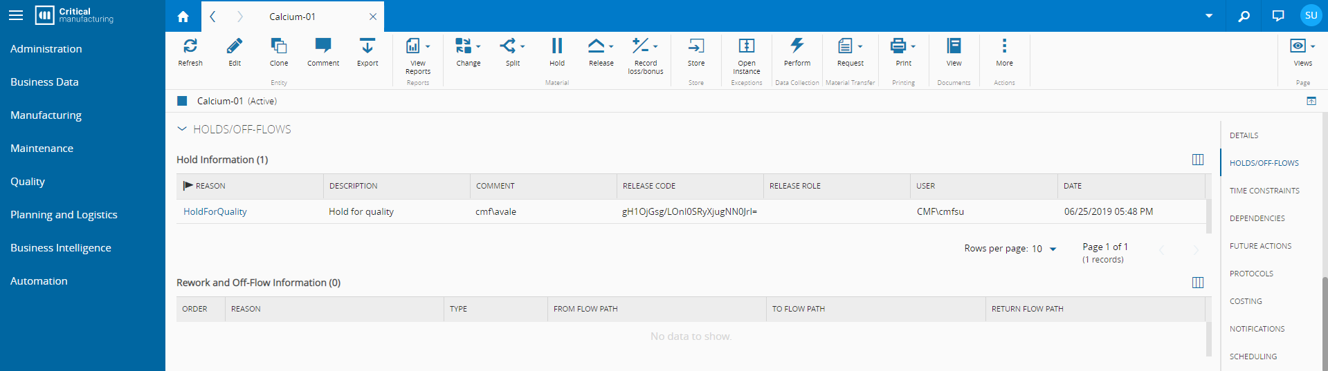 The Holds and Off-Flows section is displayed within the Material Details page and enables the user to visualize the existing Holds and Off-Flows of a particular Material.