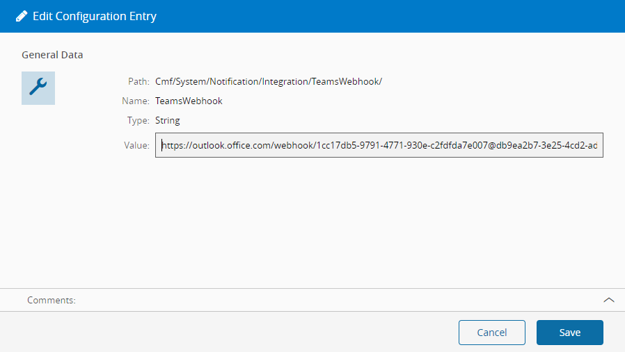 /Cmf/System/Notification/Integration/TeamsWebhookentry, edit it and use the value retrieved in the previous point. Save the configuration entry.