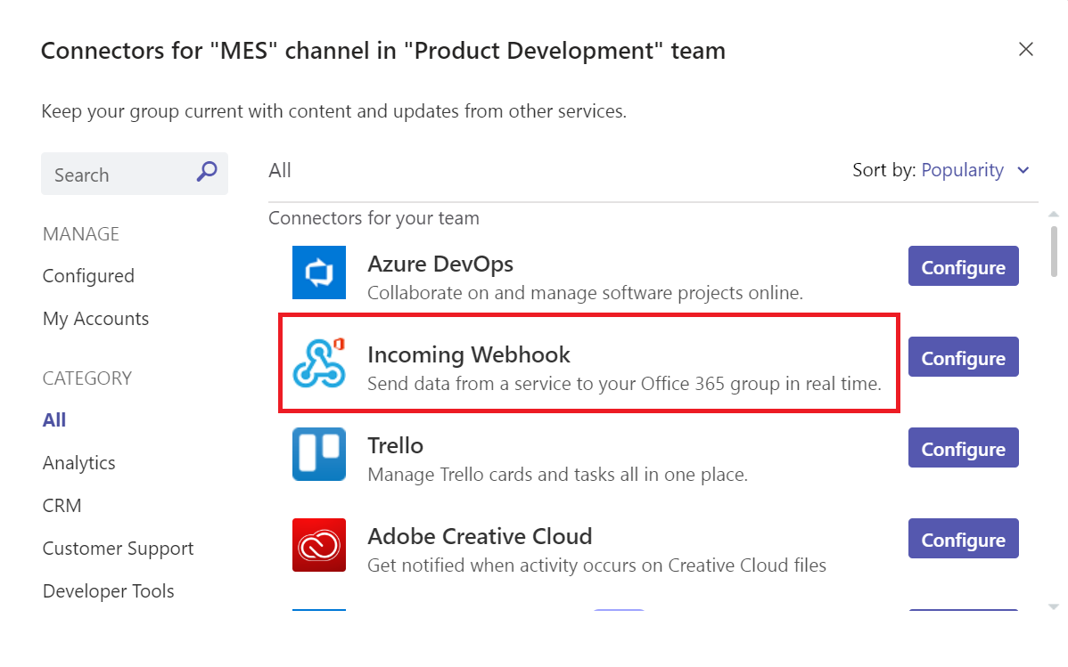 - Select Incoming Webhook and press Configure.