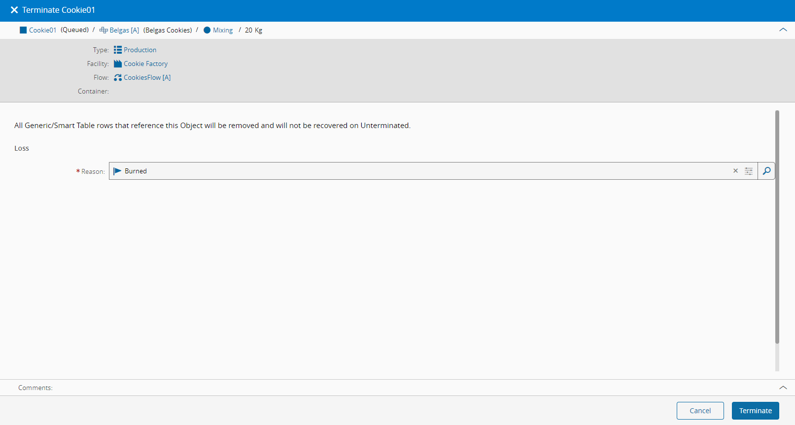 To terminate an object, open an Active or Created object, select More Actions in the top ribbon and choose Terminate. Optionally, you can enter a comment and select the Terminate button to complete the operation.