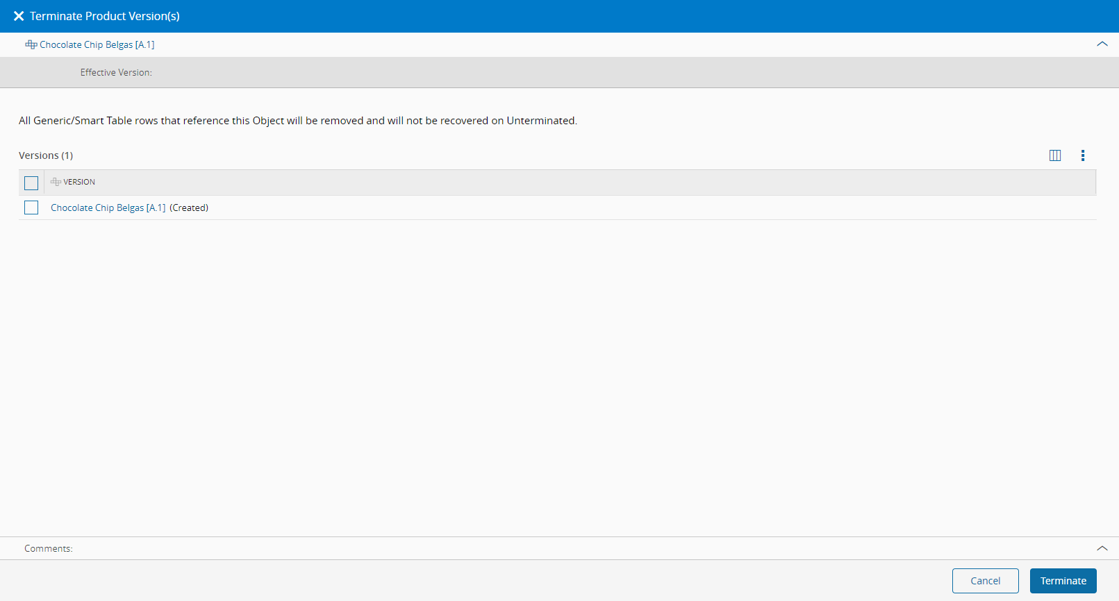 A particular version cannot be terminated. However, if the complete object has been terminated (Terminate All Versions), it is possible to unterminate the complete object. When unterminating a versioned object it will refer to the effective version (if existing) or to the highest non-terminated version at the time of termination. To unterminate a versioned object it is necessary to provide a Change Set, so that it follows the same change-control process.