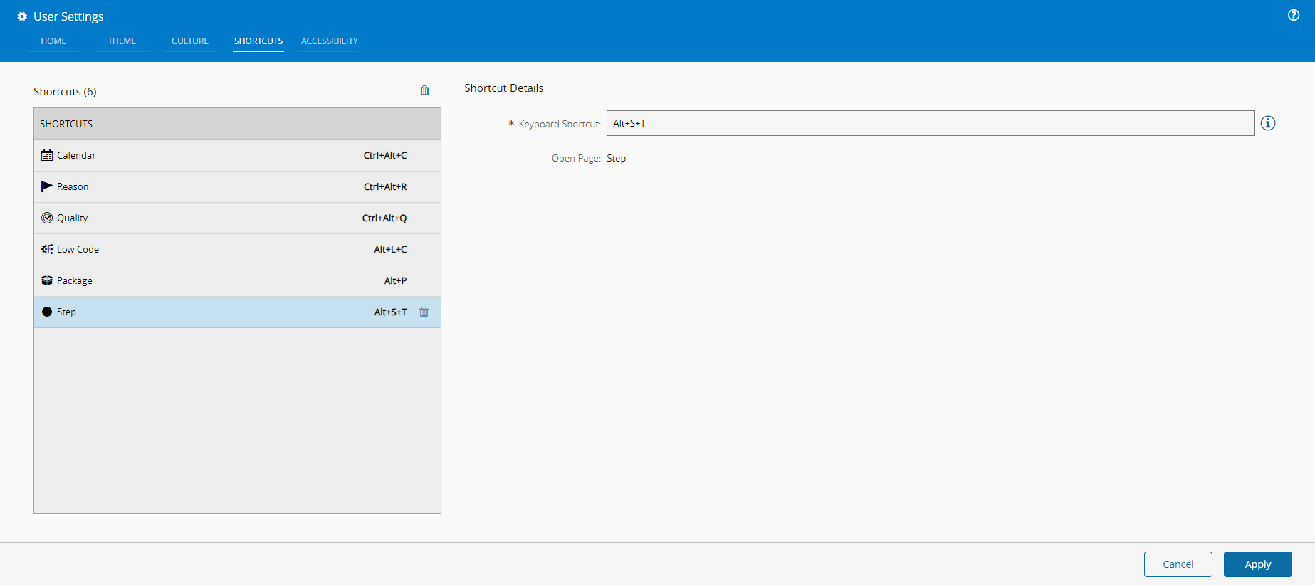 The Shortcuts tab allows you to view your User shortcuts. In this tab you can also remove already defined User shortcuts, and change their combination of keys: