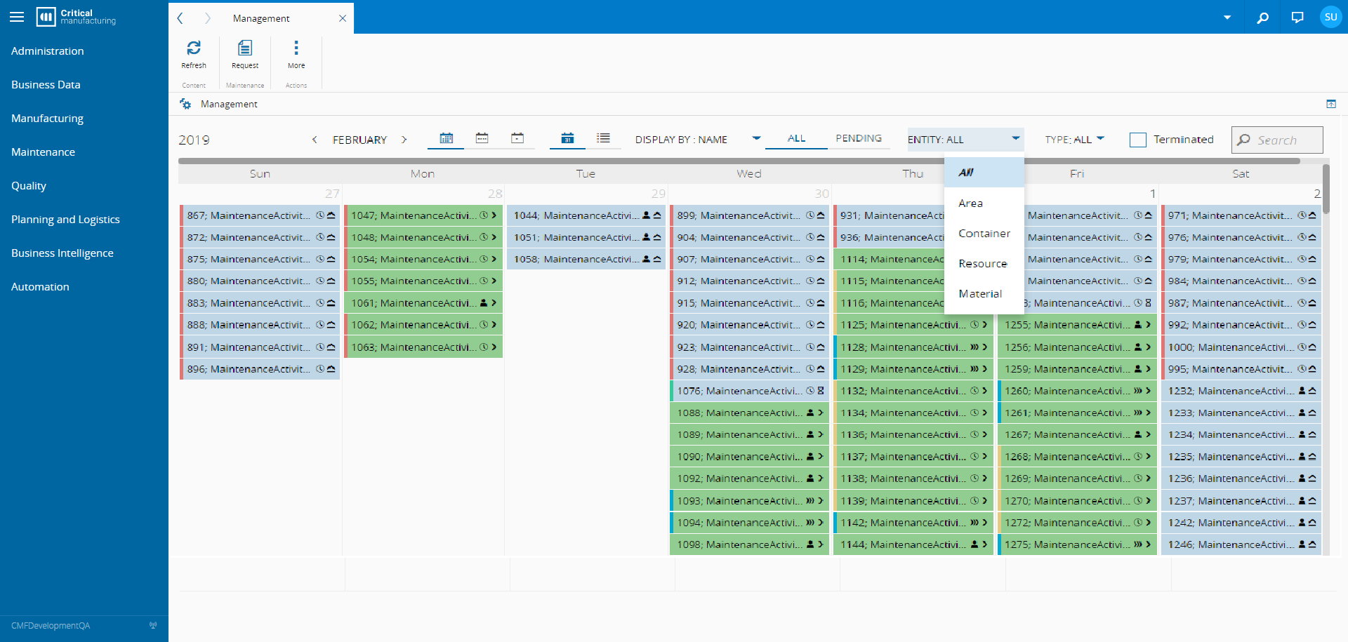 The Management View of the Maintenance Module contains a Maintenance Schedule of all the Maintenance Activity Orders which can be managed by the current user, that is, all the Maintenance Activity Orders associated with a Maintenance Plan Instance that have an OwnerRole to which the user belongs.