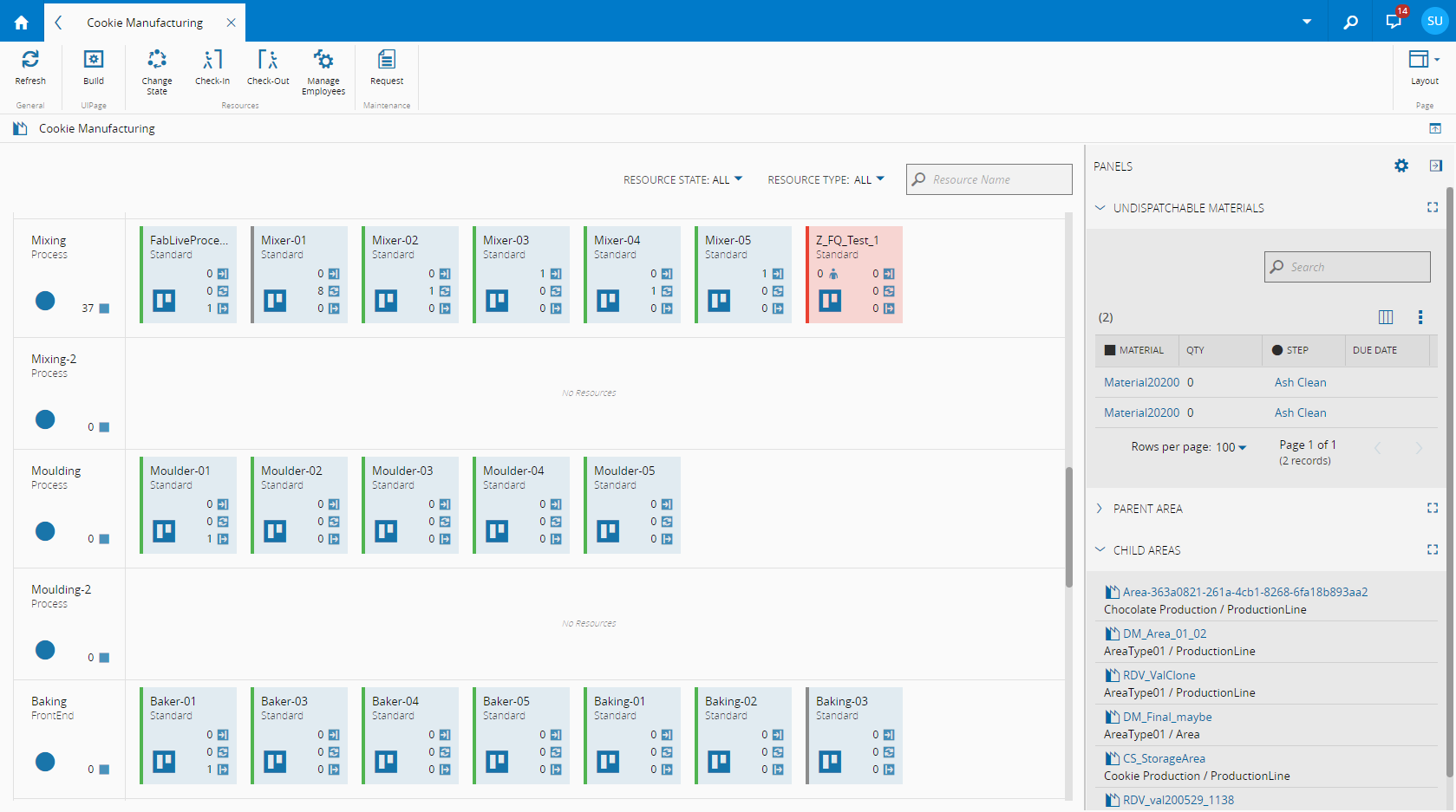 The Resource View shows an overview of the available Materials for processing at the selected Resource in the Dispatch List tab which includes only Materials in state Queued. In the Materials at Resource tab, the system displays all the Materials which are currently associated with the Resource. The total count for each of these states is shown alongside the Resource Name and State.