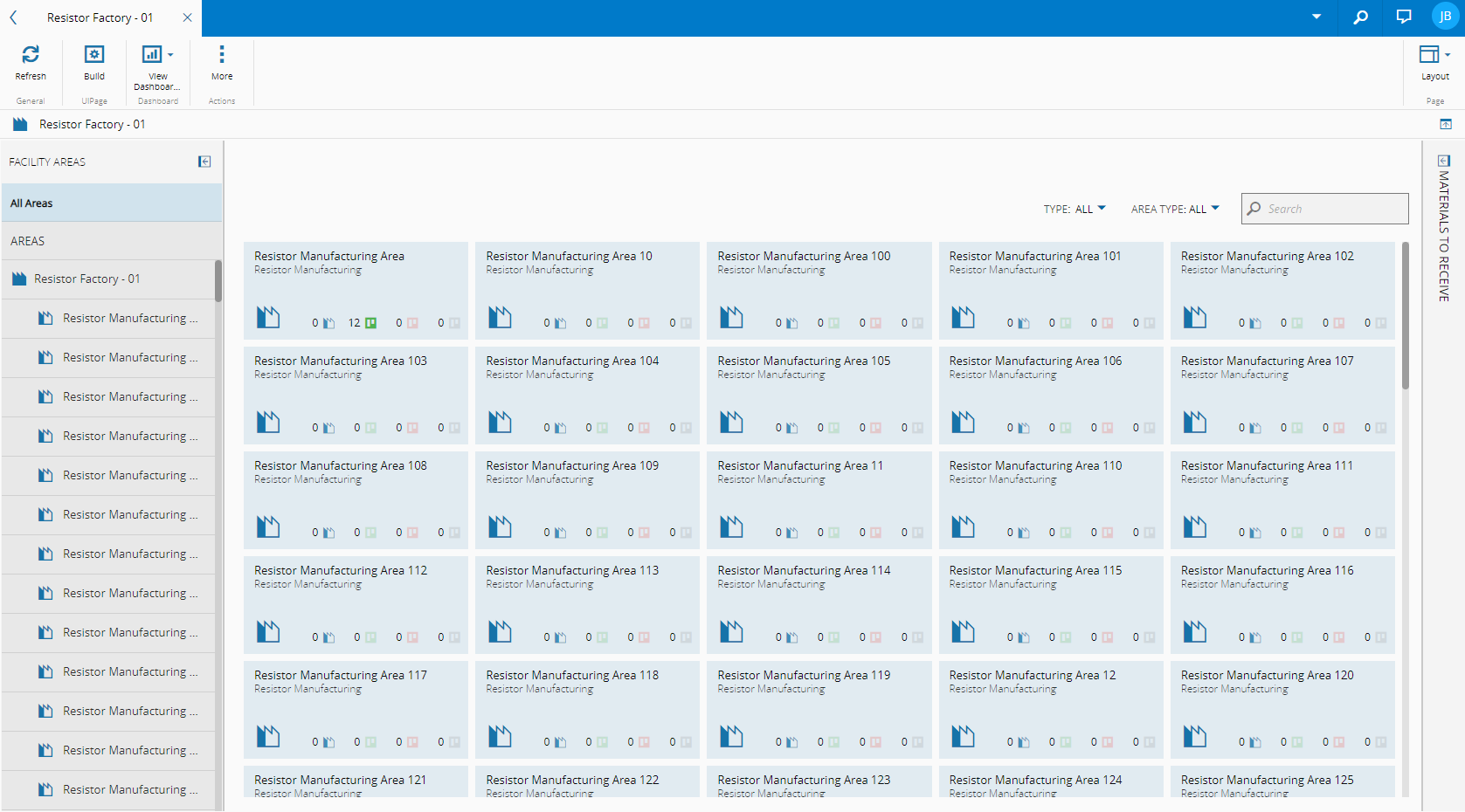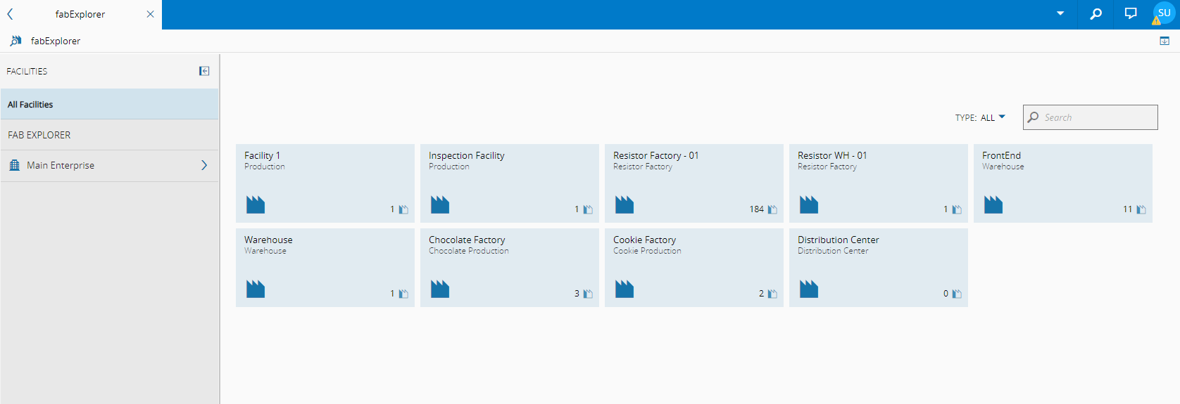 The third highest level is displayed by default as a list when fabExplorer is opened and presents an overview of the different existing Facilities. It is also possible to filter the results by using either the Type filter or the Search bar. It is also possible to see the number of Areas that the Facility contains at the bottom-right corner of every Facility tile.