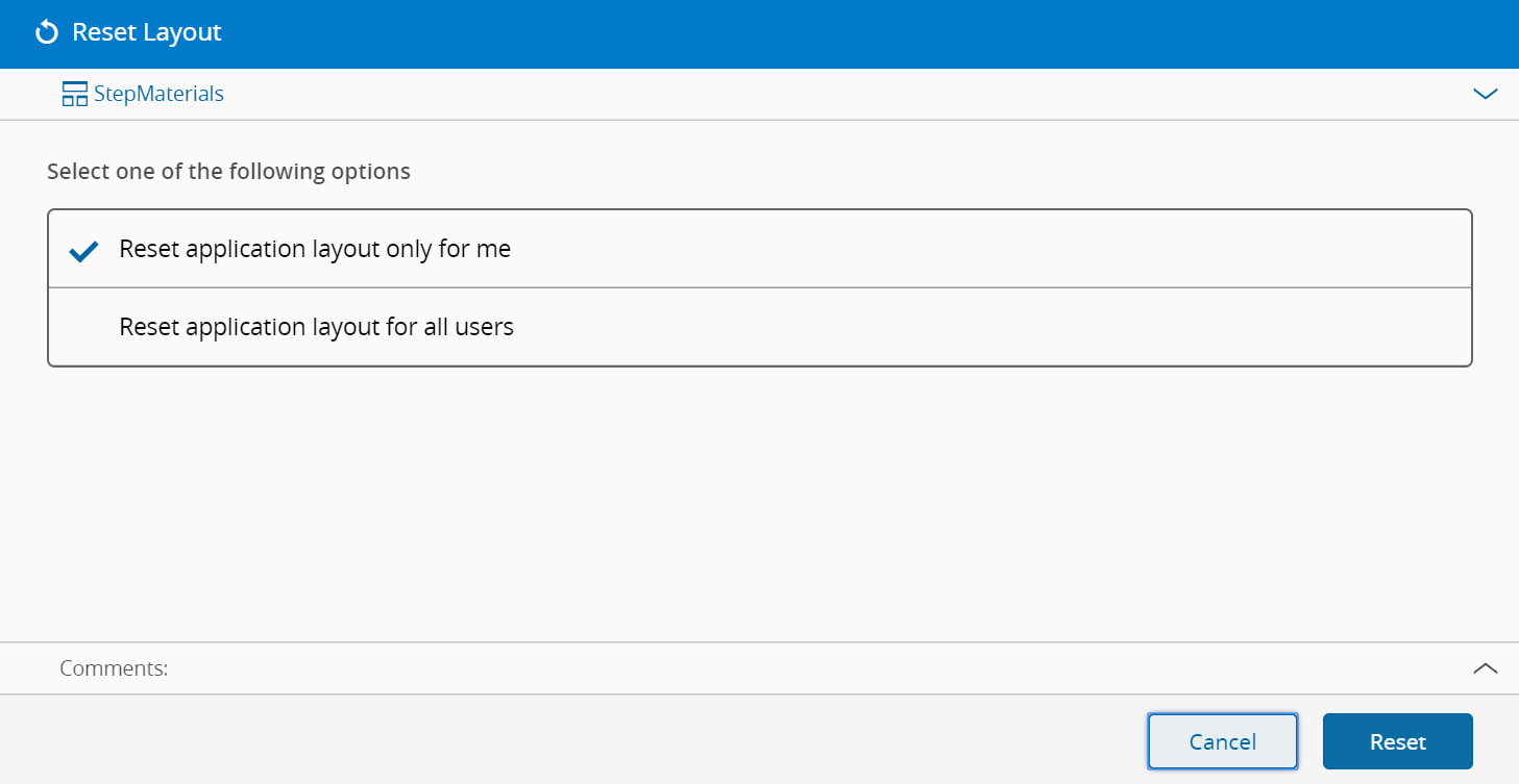 The Reset Layout option enables you to restore a previously defined application layout configuration for you or for all users.