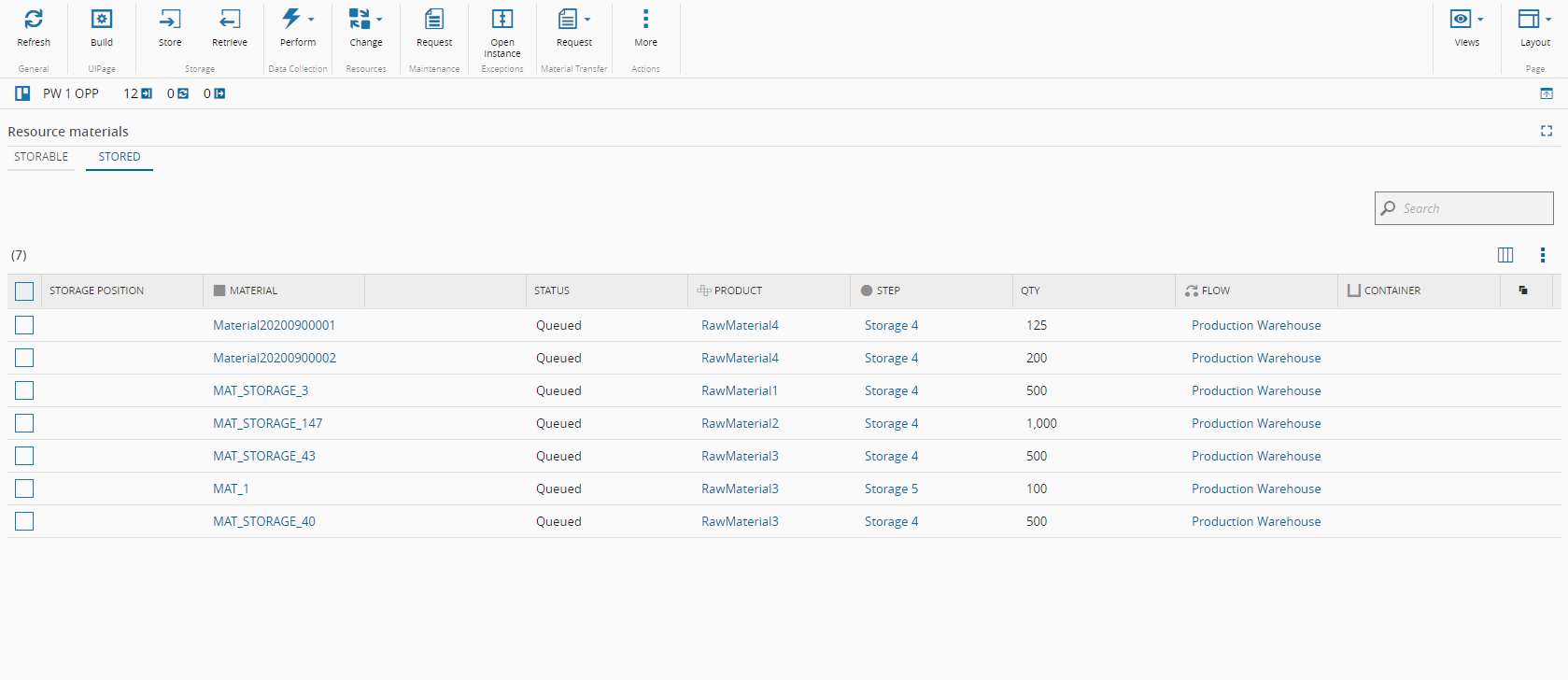For Resources of processing type Storage, the view will be slightly different from the one displayed for Process Resources. The stored Materials will be listed, as well as the Materials that can be stored in the Resource.
