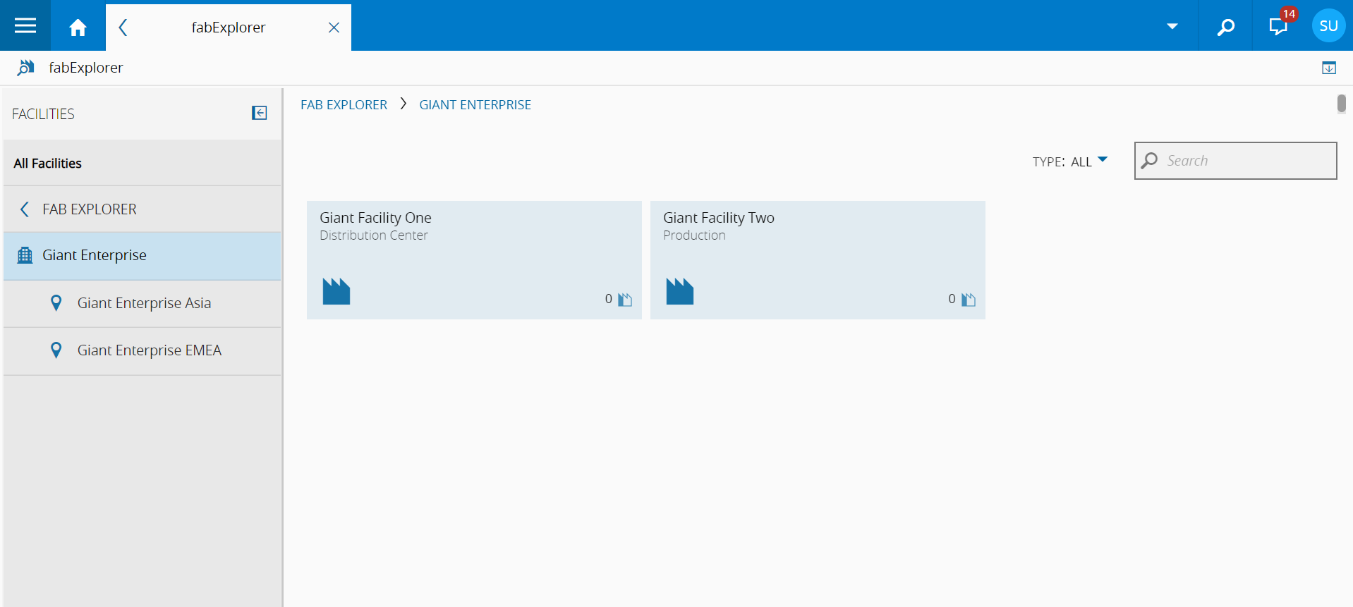 The highest level, and also the landing page when fabExplorer is opened, presents an overview of the different existing Enterprises and remote Sites on the left navigation pane, where you can select how to drill-down into the bottom levels and the entire list of available Facilities is displayed on the right data pane. It is also possible to filter the results by using either the Type filter or the Search bar.
