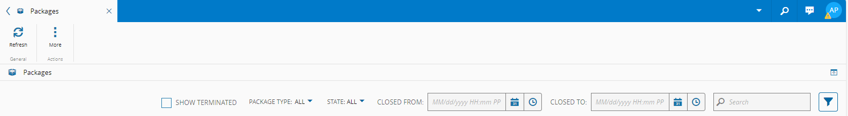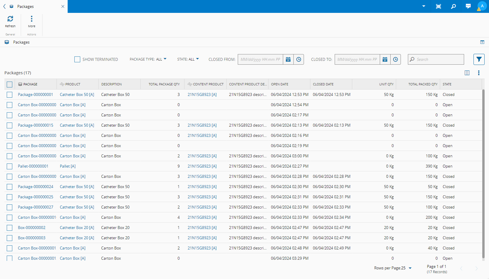 If the Material Logistics module is properly licensed in the system, the Packages page will list all the active Packages in the system and allow you to view package information under each column: