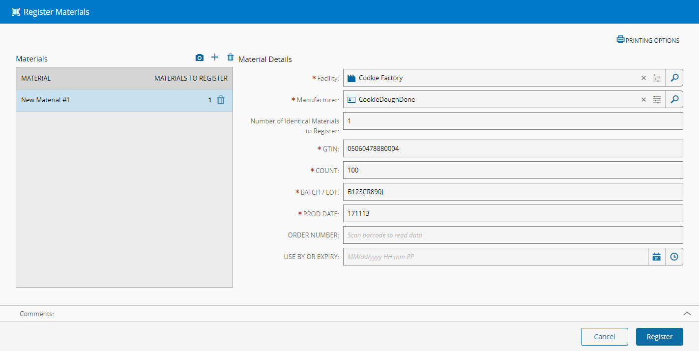 The Register Materials operation provides a simple Material creation process with support for barcode scanners of different types (ECIA, GS1 and MAT-Label) and, if configured to do so, writes the results to a predefined label and sends them to a predefined printer.
