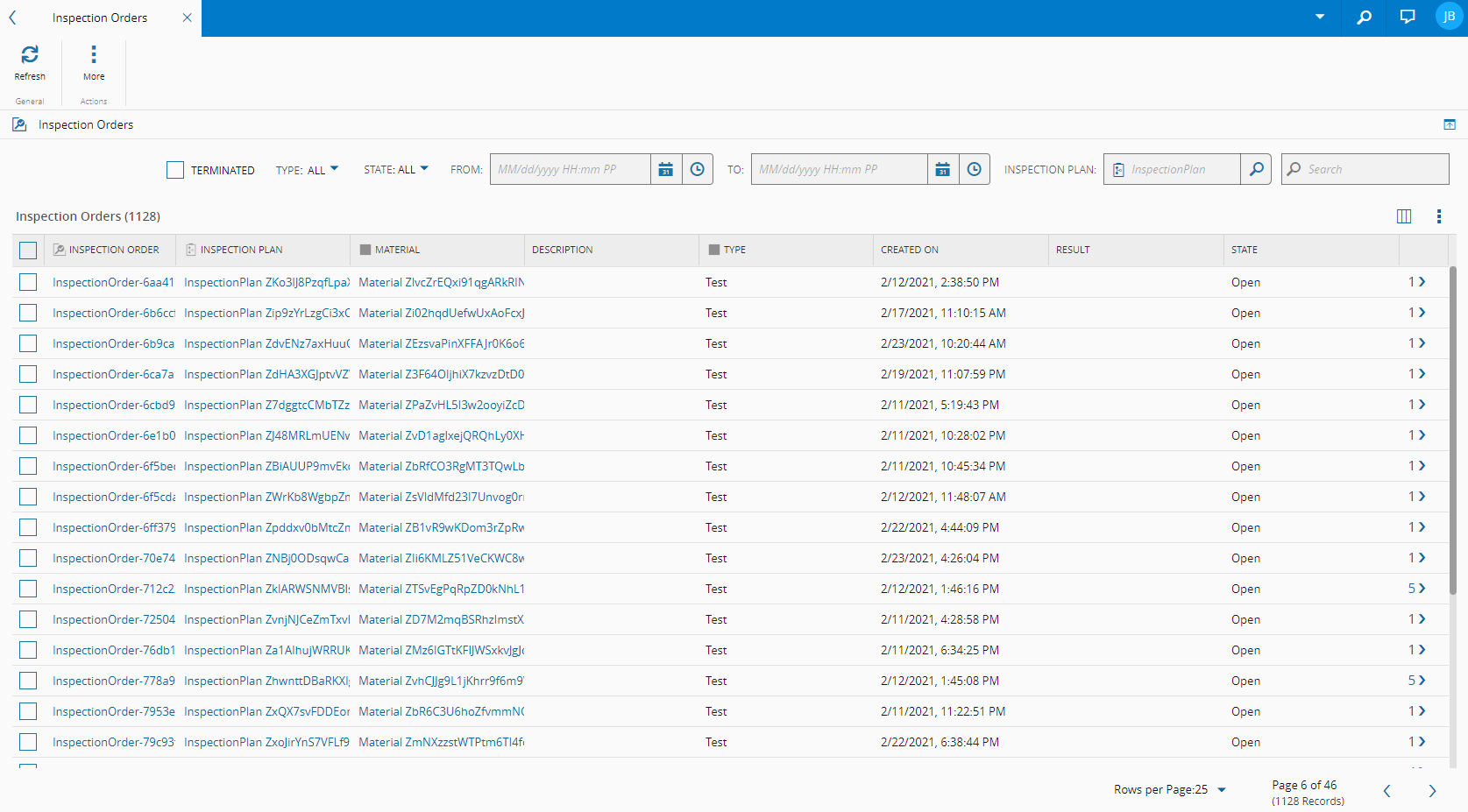 The Inspection Orders page lists all the active Inspection Orders in the system, allowing the user to have a bird's eye view of the status of Inspection Plans and also to perform operations on multiple Inspection Orders simultaneously, provided the adequate conditions are met. Since a Inspection Order can have specific samples per Step and Material, a list of the Inspection Order Step Material Samples contained in each Inspection Order can also be viewed in this screen, on a tab immediately next to the Inspection Orders themselves.