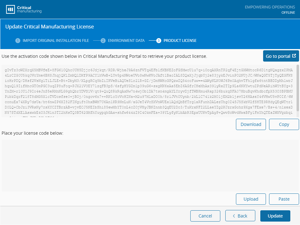 - Paste the Activation Code from the Setup - Offline update license operation: