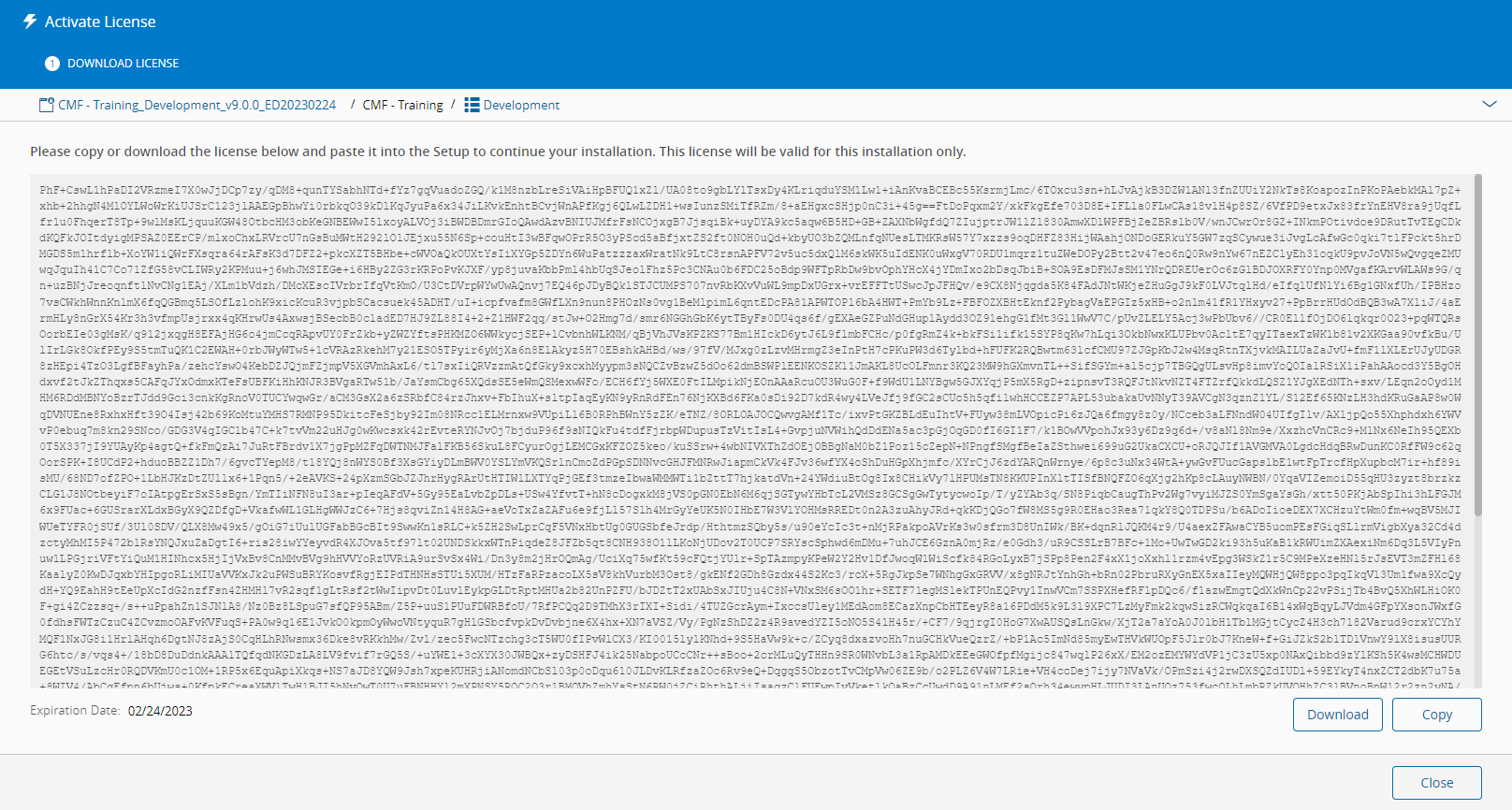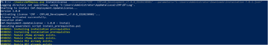 .\tools\CmfDeploy.exe installlicense --licenseId="CMF - CMFLAB_Development_v7.0.0_ED20230901" --parameters="C:\Users\Administrator\Downloads\installation 7.0.2.json"