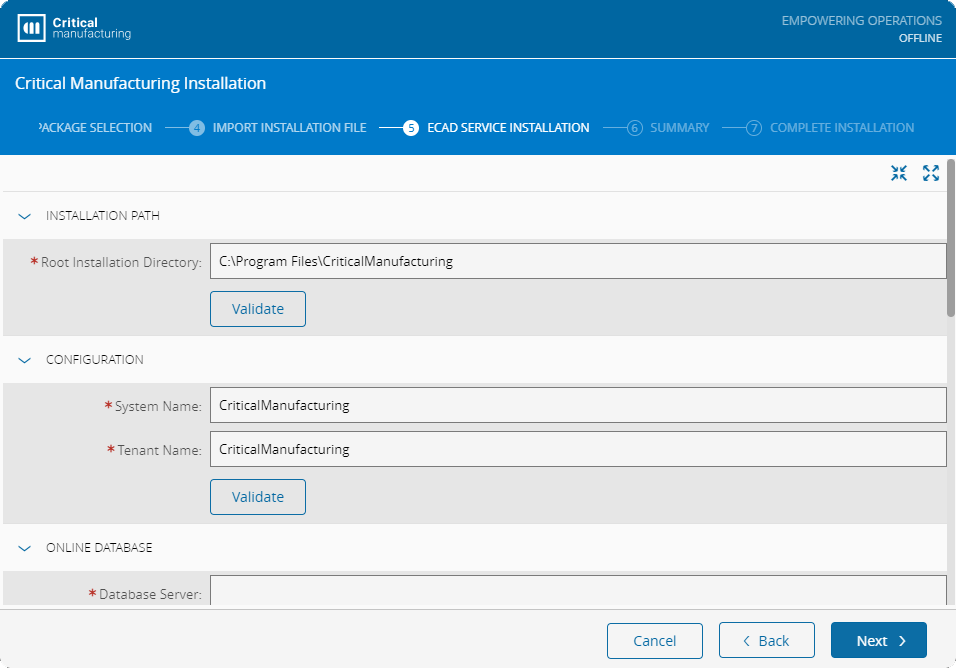The Critical Manufacturing MES installation procedure is supported by an installation wizard that is described step-by-step in this section. Depending on whether the installation is performed with or without Internet access, and on the chosen installation package, the setup's interface may present changes. Therefore, you may notice slight differences between the screenshots included in this guide and the version being installed.