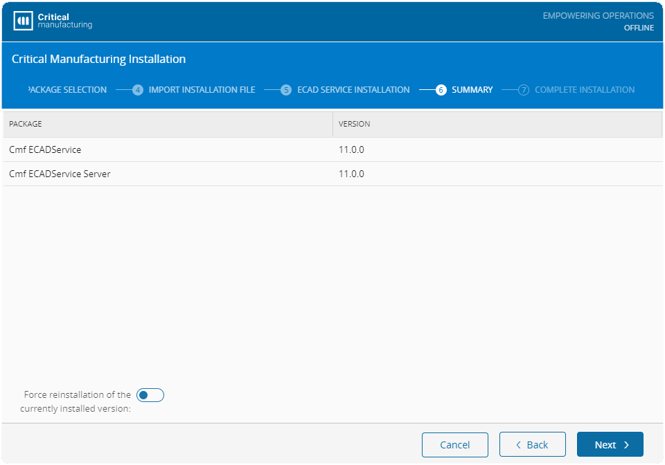 Confirm the settings and select Next, where you will be shown the summary of the component you are about ot install. You have the option to force a reinstallation if you have previously installed a version of this component in your system.