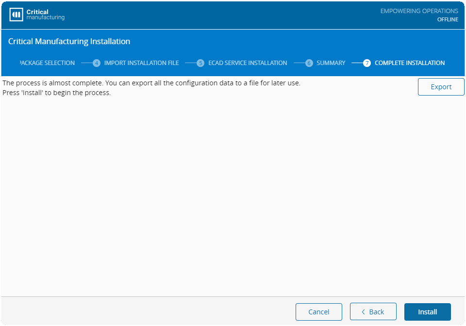 In the Complete Installation screen, you can export all the current installation configuration data (including licenses) to a file. To export the current configuration data, select Export and then choose a location and a file name.