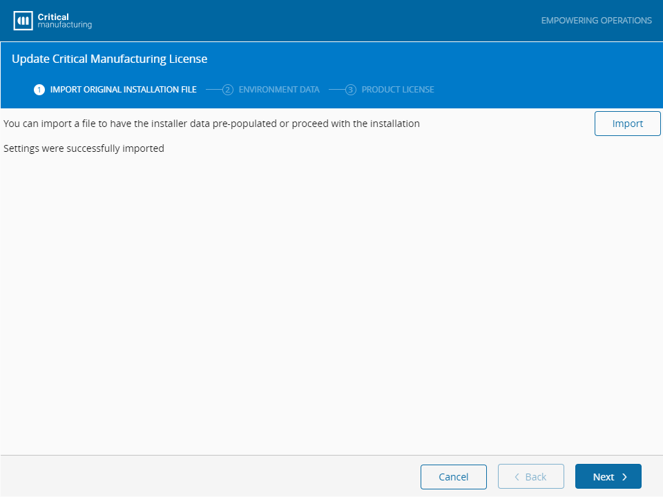 The Import Installation File step allows you to load a file with the configuration of the installation. It will automatically fill out the information existing in the selected file.