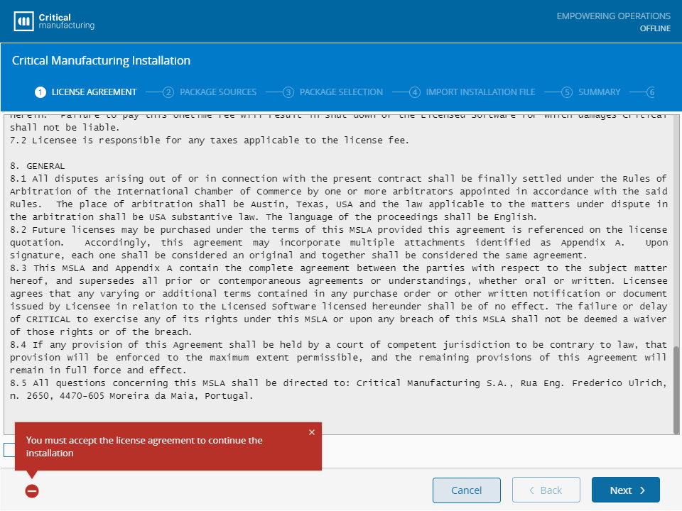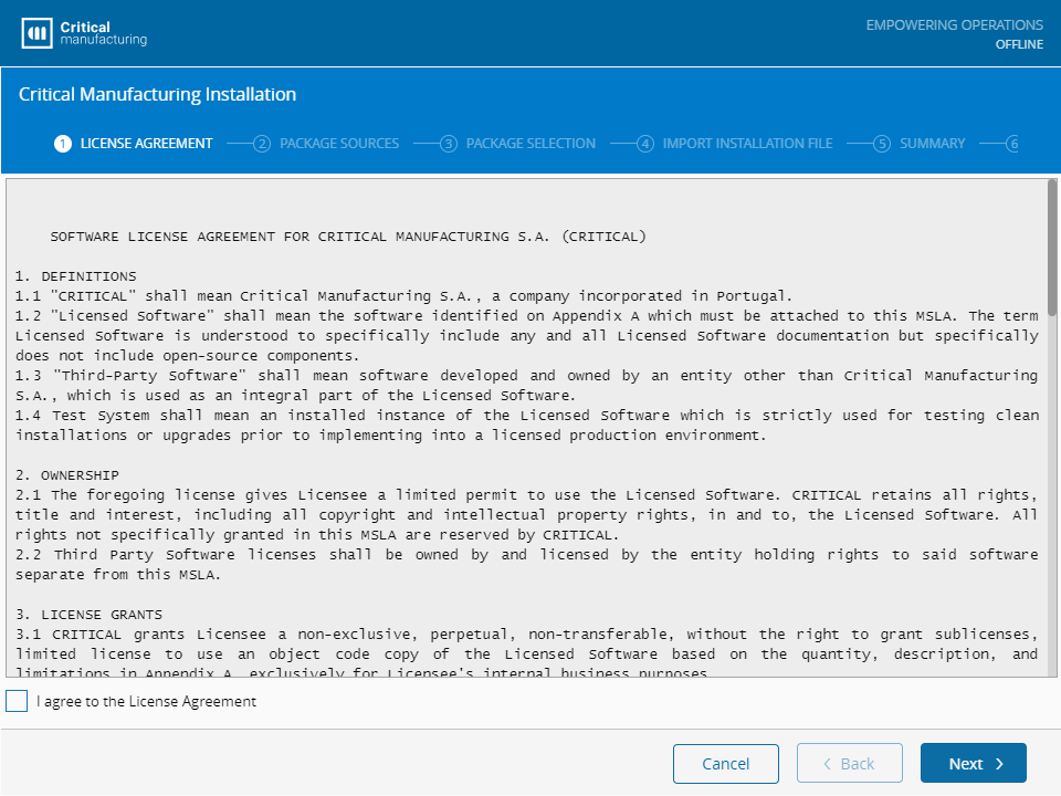 In this step, you need to read and agree to the Critical Manufacturing License Agreement.