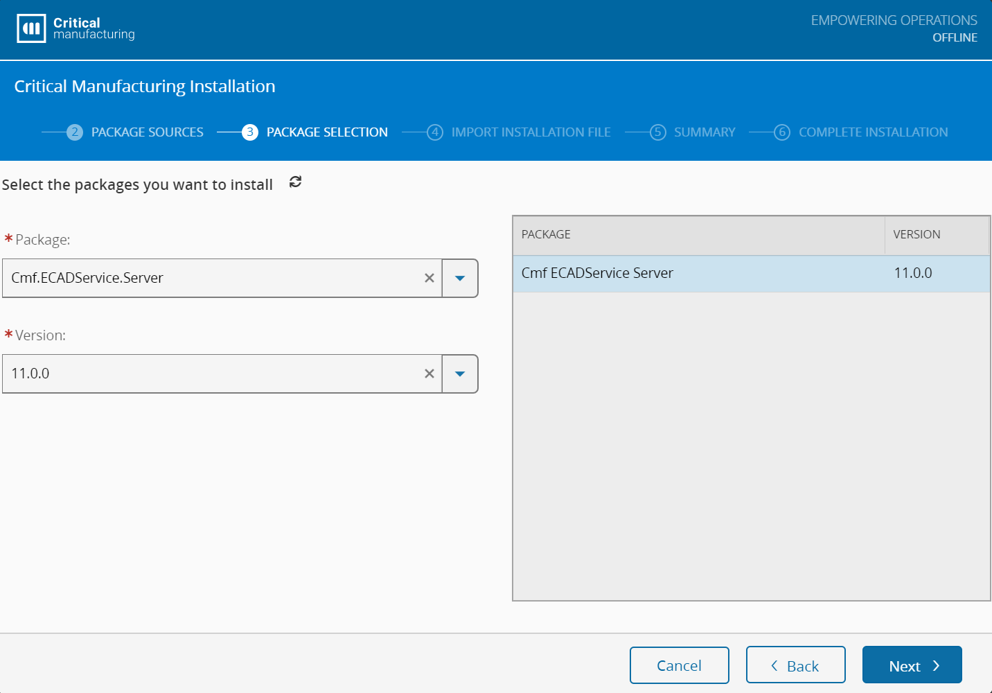 In the Package Selection screen, you must select the product and the version to be installed. The available packages are: