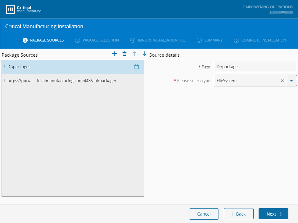 In the Package Sources step, you can add a location to search for installation packages. You can also add multiple package sources, and dependencies are resolved using the provided source order. If the setup is running in Online mode, the default process will add the local packages folder, and the server, to the list.