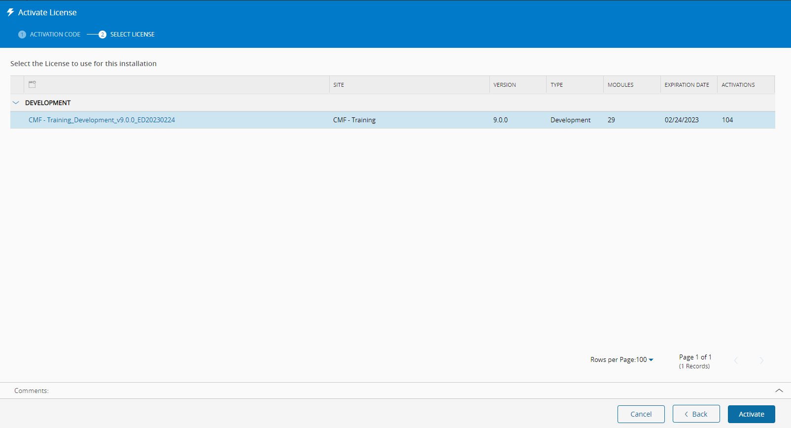 - Then select the required Environment License and Activate it: