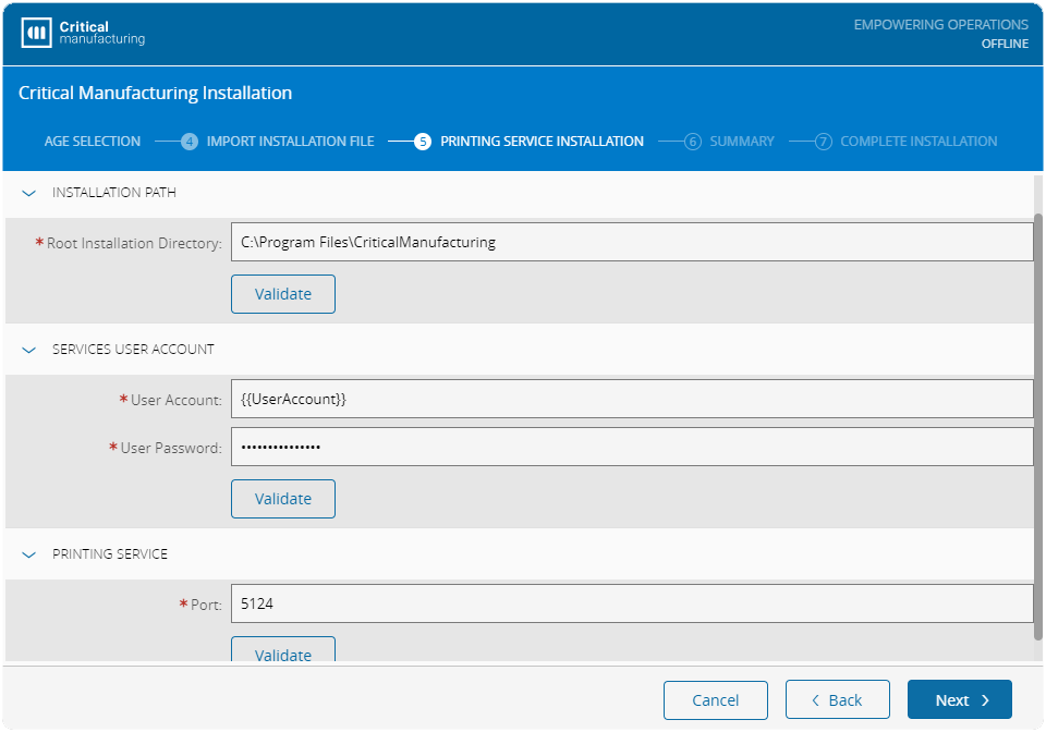 After selecting the Printing Service package, the user must fill (or import from a parameters file) the following information: