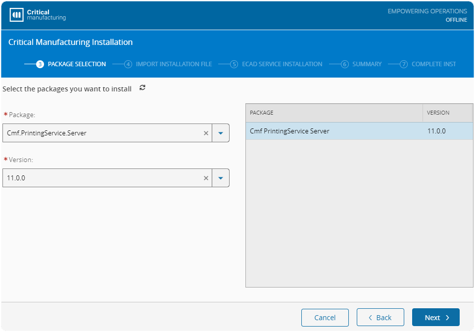 The Printing Service is installed using the same setup process as the traditional installation and selecting the Cmf.PrintingService.Server option in the Package Selection screen.