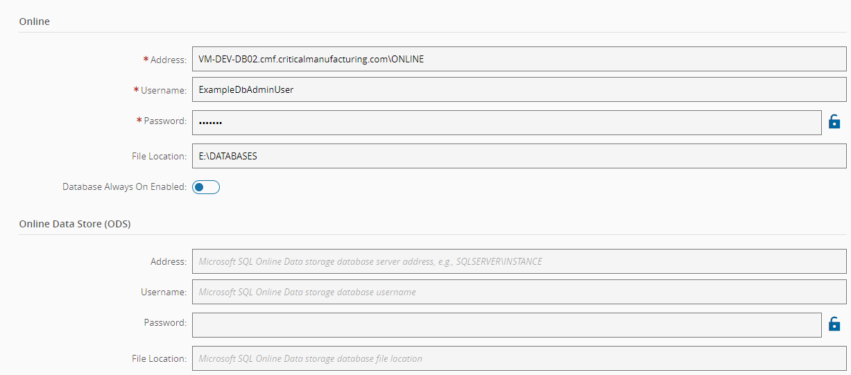 - Password - database SA user password. If left blank, will default to the Online database value.