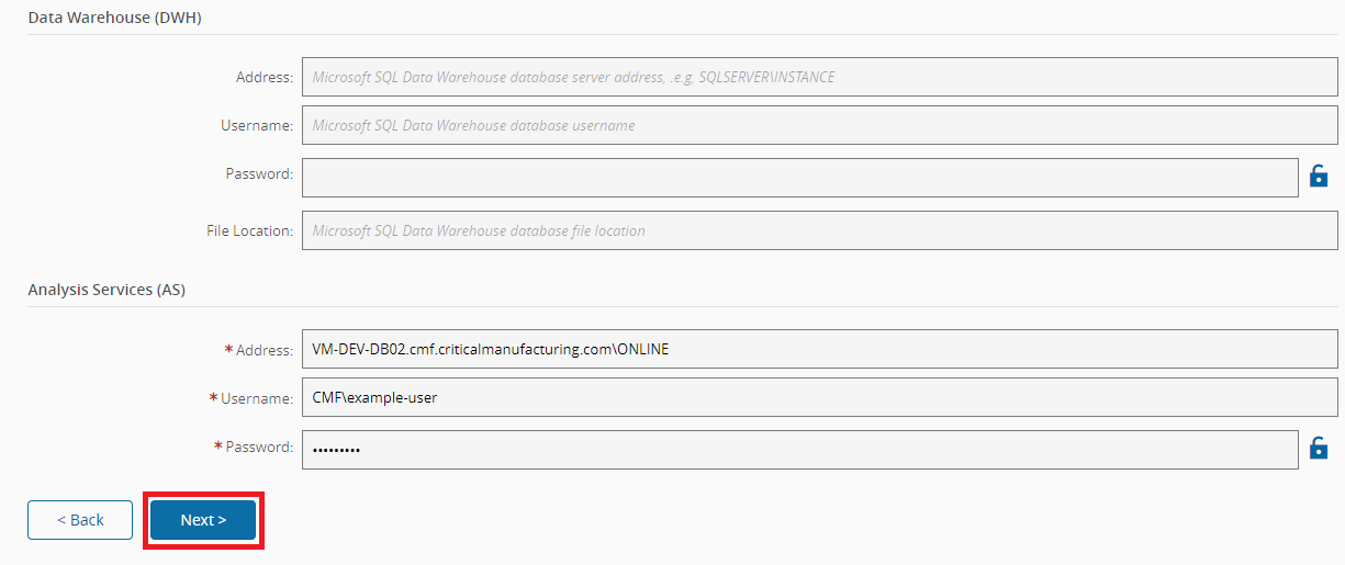 - Data WareHouse (DWH) - DWH database information. Applies to Database Modes: MES Analytics.