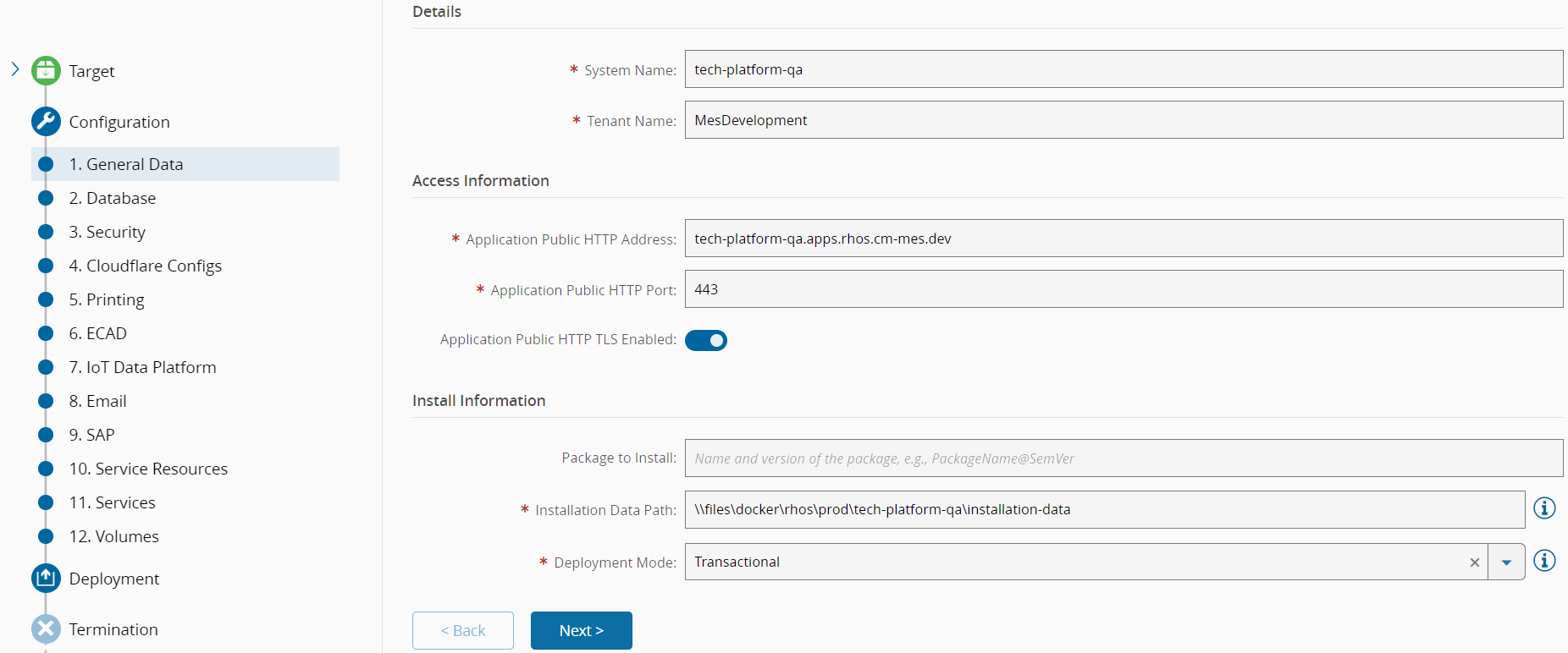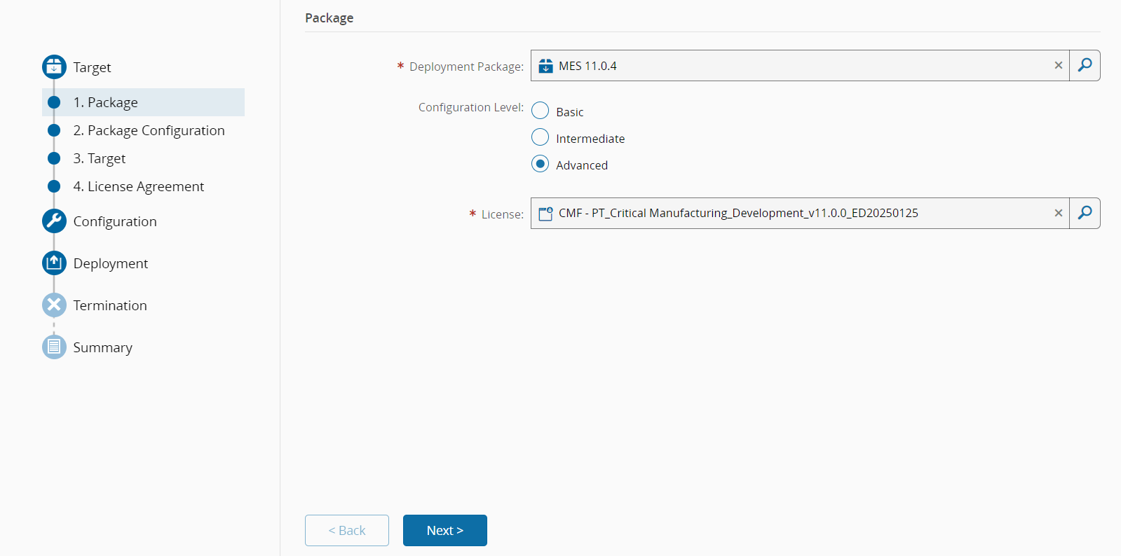 - Deployment Package - base package to be used. Since you are installing a Critical Manufacturing MES 11.0.4, set the value to