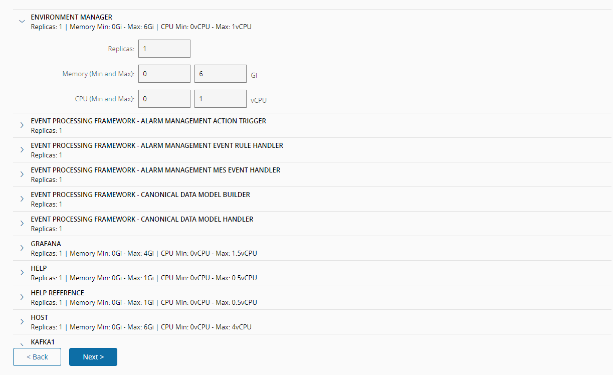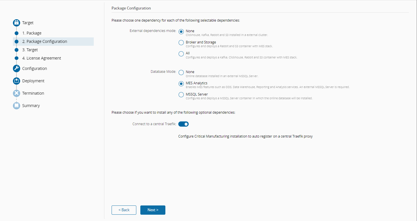 MES Analytics, the External dependencies mode set toNoneand the opt-in feature Connect to a central Traefik set totruesince you have an Infrastructure Agent configured and running.Set the values as shown in the example above and select Next.