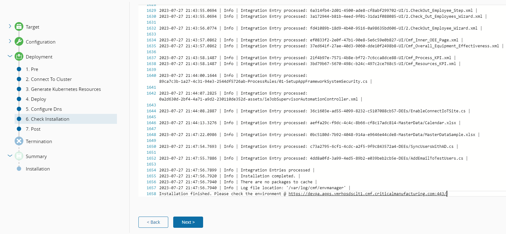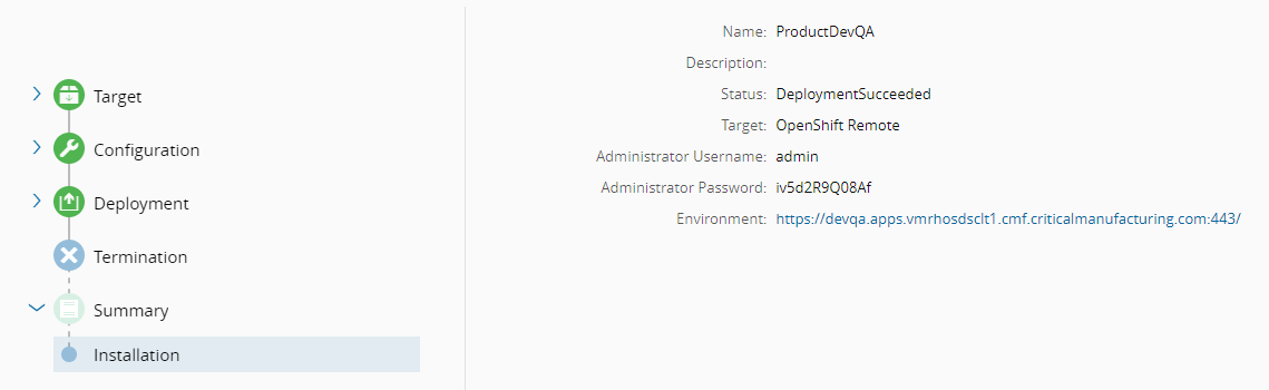 If everything is correct, the last screen should present you with the deployment Summary, which includes information such as the outcome, admin credentials to use to access the environment, and the URL.
