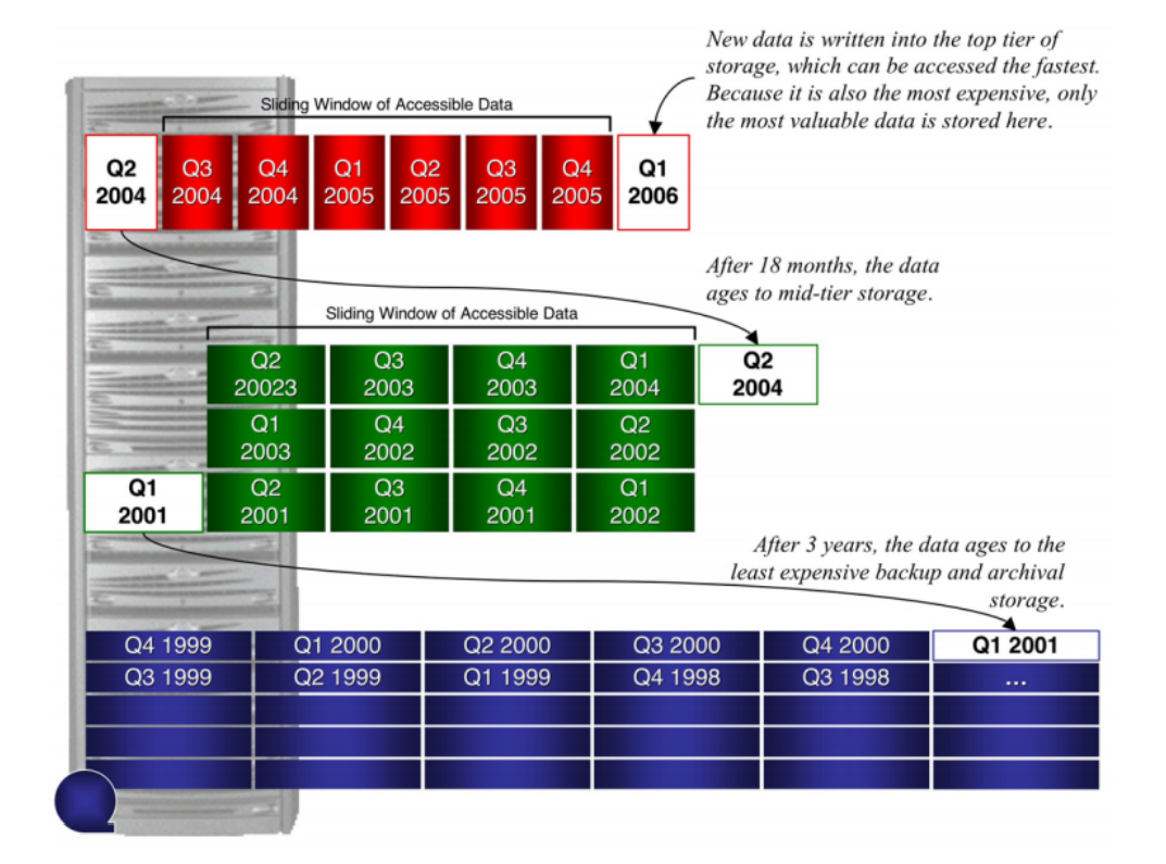 “滑动窗口:更便宜的储存方案”涉及将新分区滚入高性能I/O子系统,并将旧分区滚出高性能I/O子系统。仍然可以访问所有数据以进行查询或更新,但是预计最需要的数据可以驻留在更快的I/O子系统中,从而提高整体性能。例如,此类架构支持将最新6个月的数据保存在固态驱动器上,并将较旧的数据保存在15k串行连接SCSI驱动器上,而几乎不需要维护工作。关键是通过经济实惠的解决方案尽可能提高性能。