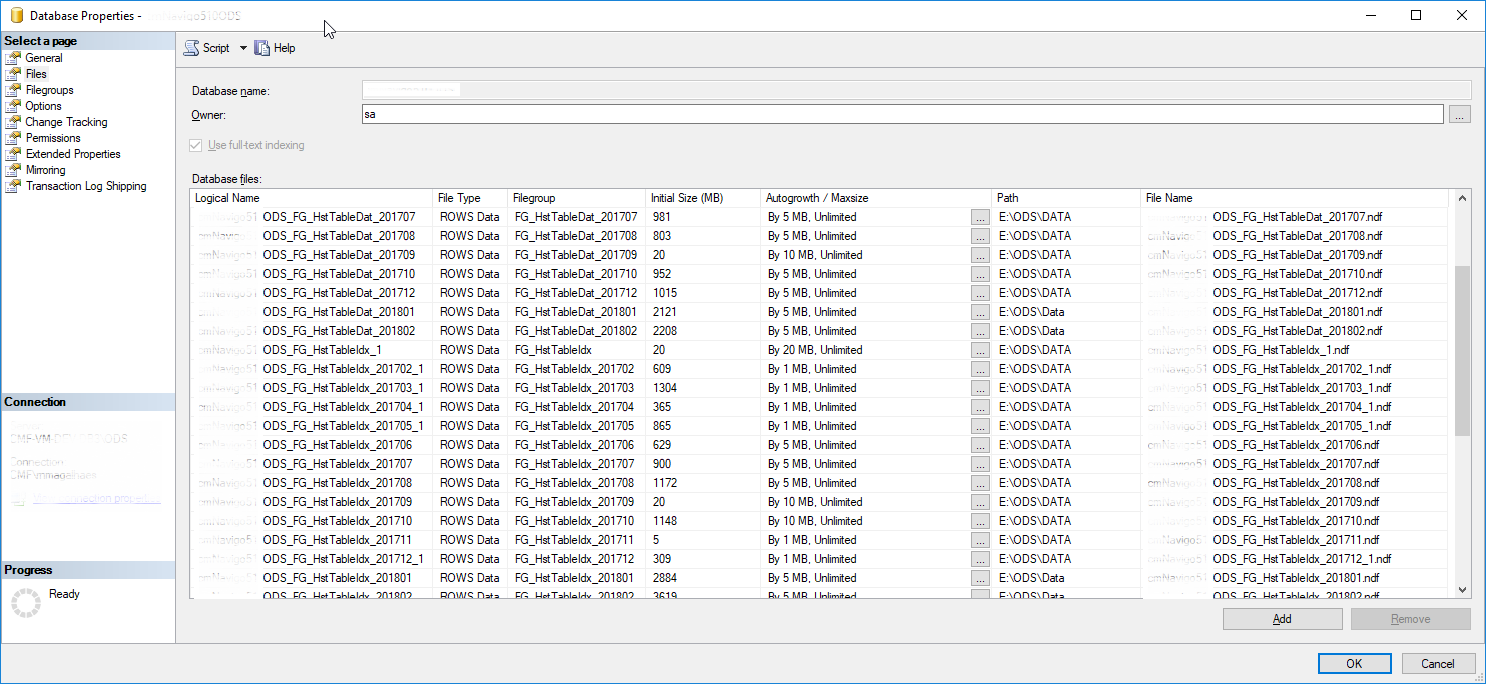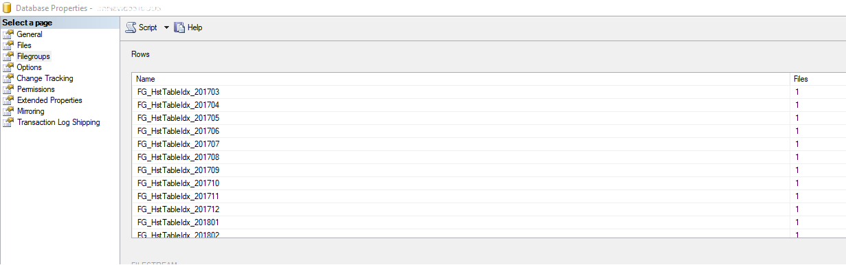 如您所见,每月有一个xxxODS_FG_HstTableDat_YYYYMM和一个xxxODS_FG_HstTableIdx_YYYYMM数据文件与相应的文件组(FG_HstTableDat_YYYYMM和FG_HstTableIdx_YYYYMM)。 此外,图片并不代表它,但是对主实体表应用分区时,您还应该找到每月命名格式为xxxODS_FG_MainTableDat_YYYYMM和xxxODS_FG_MainTableIdx_YYYYMM的数据文件,以及相应的文件组FG_MainTableDat_YYYYMM和FG_MainTableIdx_YYYYMM。