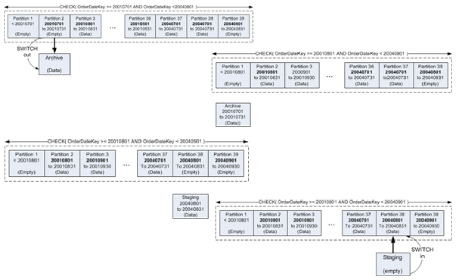 “滑动窗口:存档方案”涉及将新分区滚入分区表或视图,并将旧分区滚出分区表或视图。对旧数据进行存档时,新数据可供用户查询。关键是在移动分区时尽量减少停机时间。