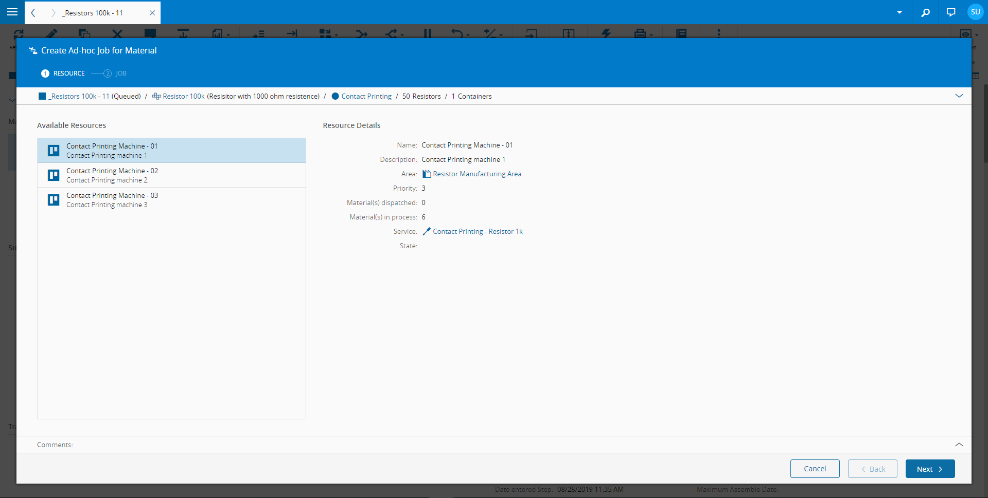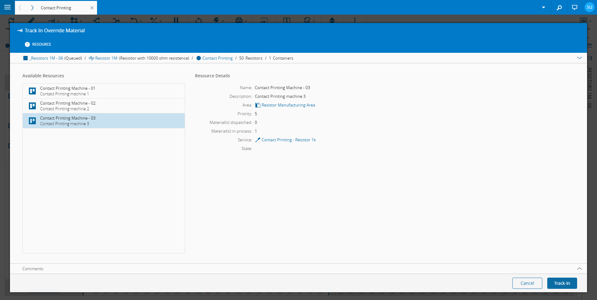 如果此分配不能令人满意或不可行,则可以通过在物料页面或工厂导览的步骤视图中执行“通过排产覆盖进站”来更改此分配,该操作的行为方式与“派工和进站”操作类似。