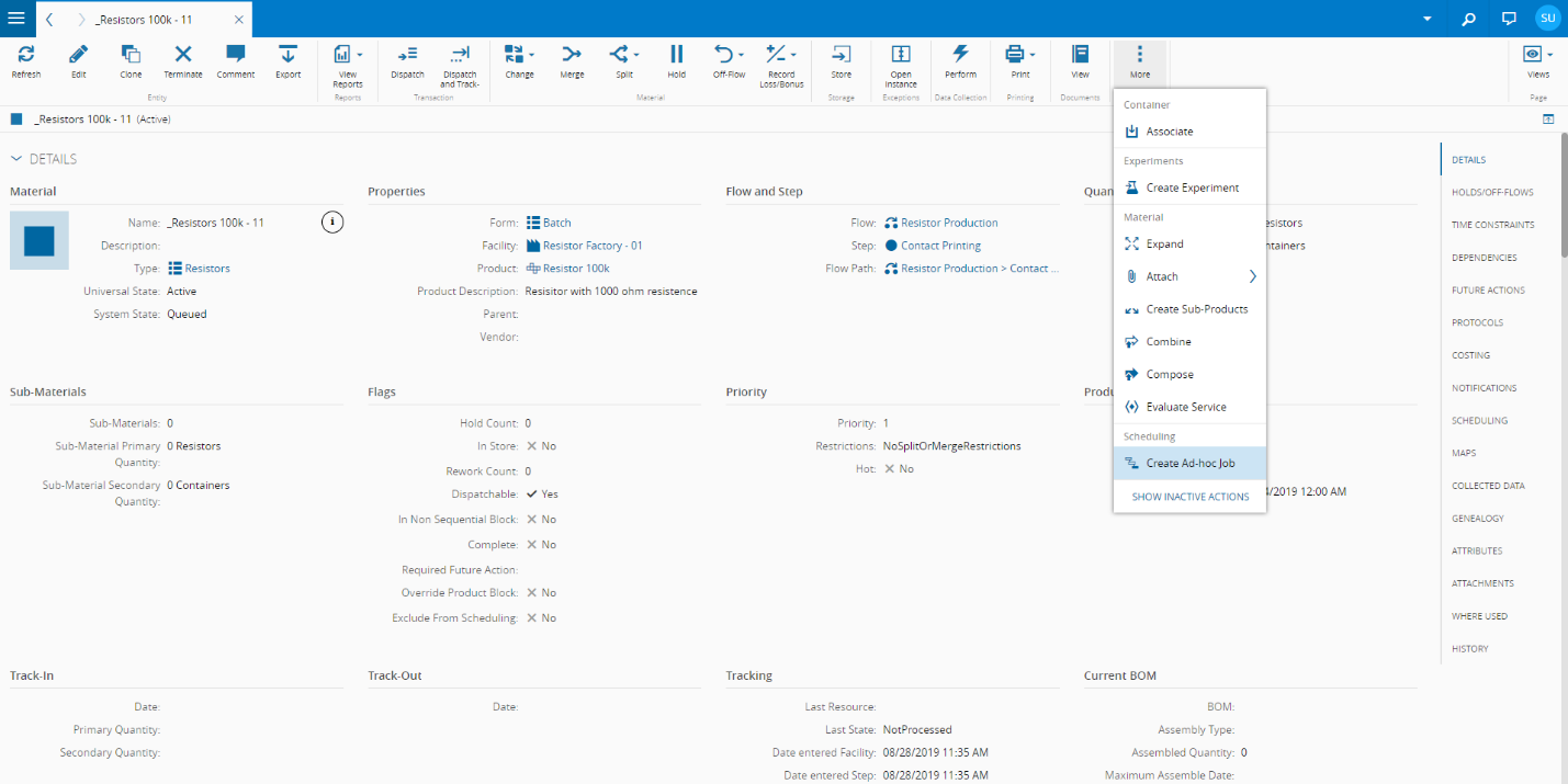 如本节前面所述,可以让系统在进站过程中验证分配给每个工作的耐用品和员工是否与资源相关联。可以通过在排产中选择某作业,打开右侧的详细信息选项卡并分别展开“耐用品”或“雇员”选项卡,来检查哪些耐用品和/或雇员与该作业相关联。